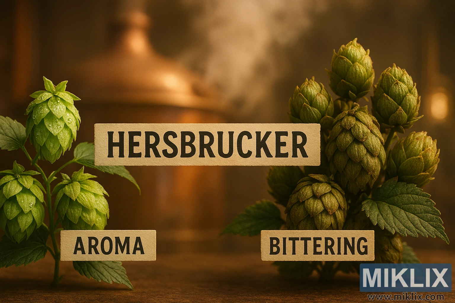 This image is ideal for educational, promotional, or catalog use, offering a clear and visually engaging representation of how Hersbrucker hops contribute to both aroma and bitterness in beer brewing.