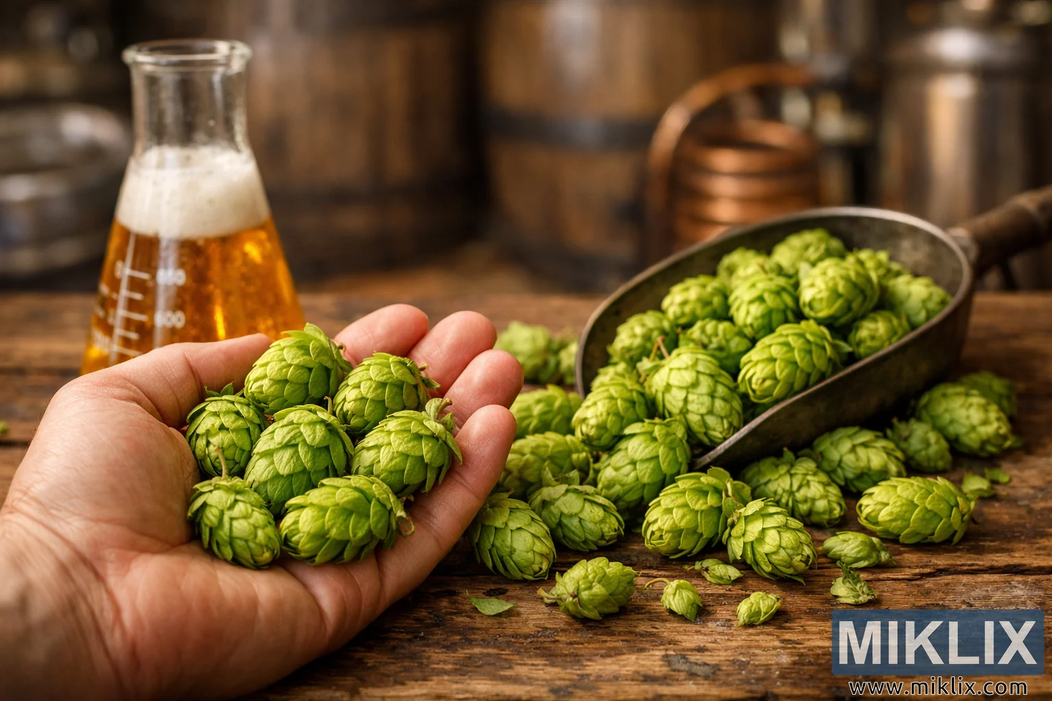 Image: Fresh Hüller Bitterer Hops in Hand on Rustic Brewery Table
