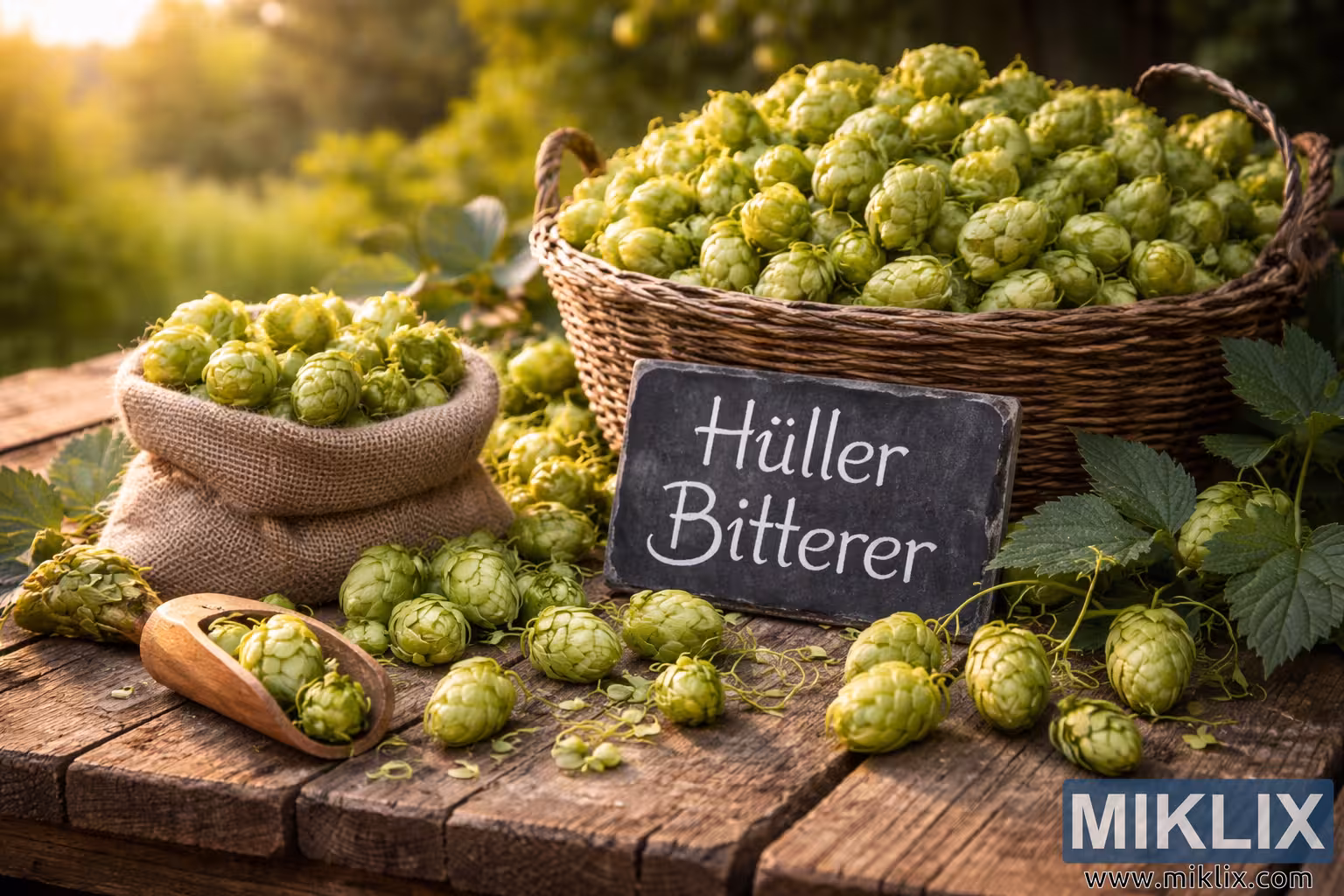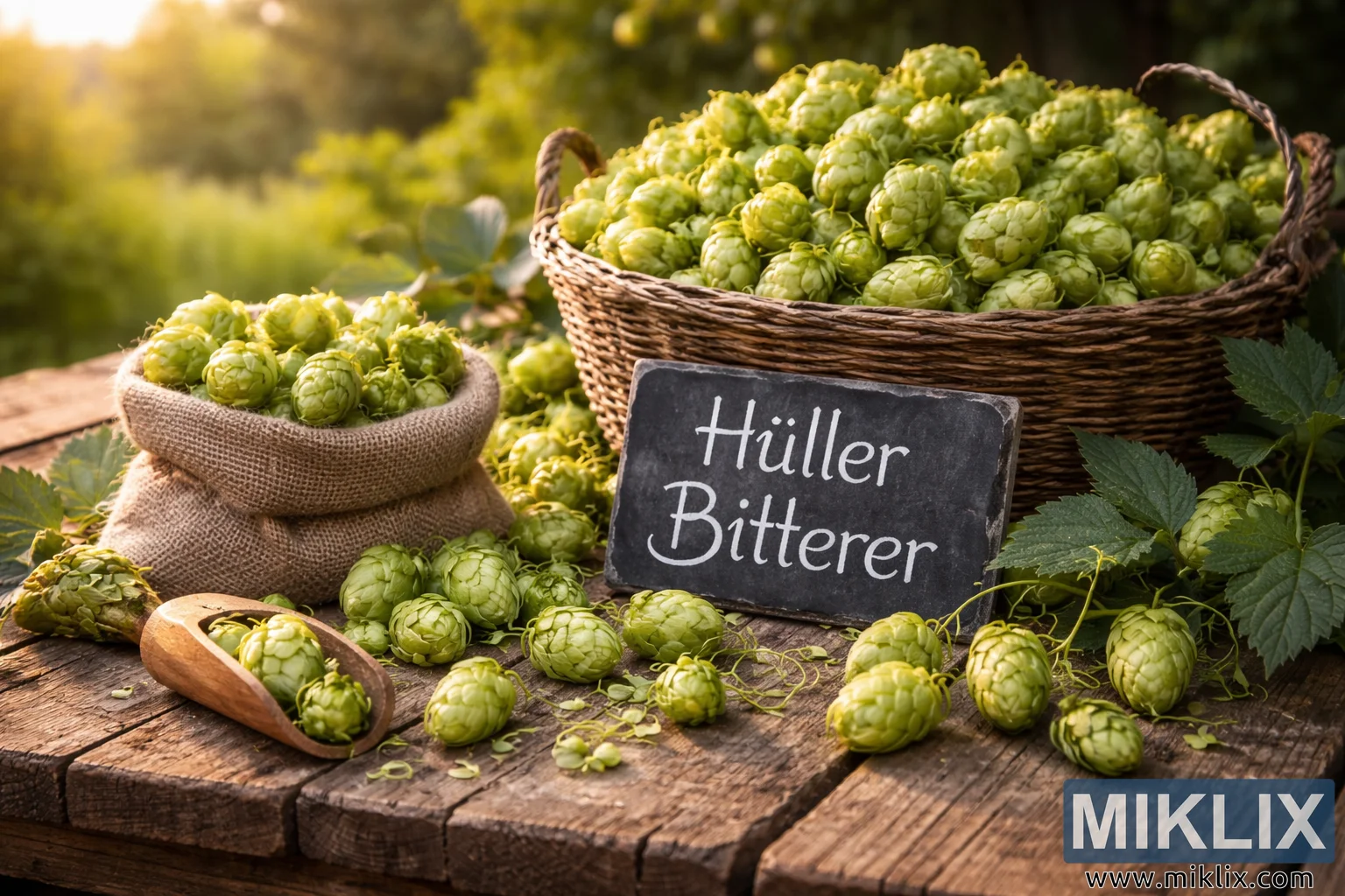 High-resolution photo of freshly harvested Hüller Bitterer hops arranged on a rustic wooden table with a basket, burlap sack, and chalkboard label in warm natural light.