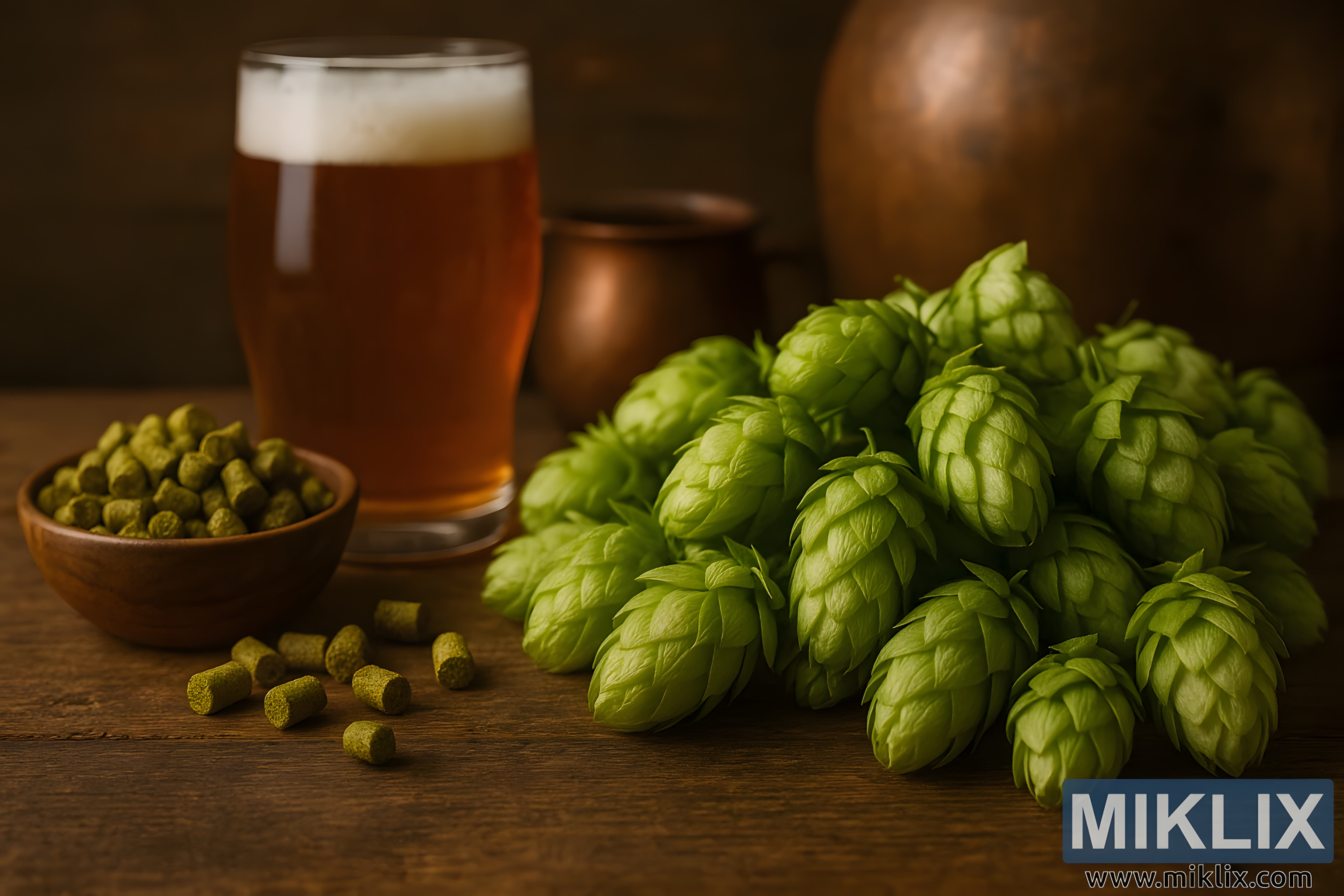 Rustic scene with fresh hops, hop pellets, and a frothy amber beer beside a copper kettle, evoking the earthy textures of artisanal brewing.