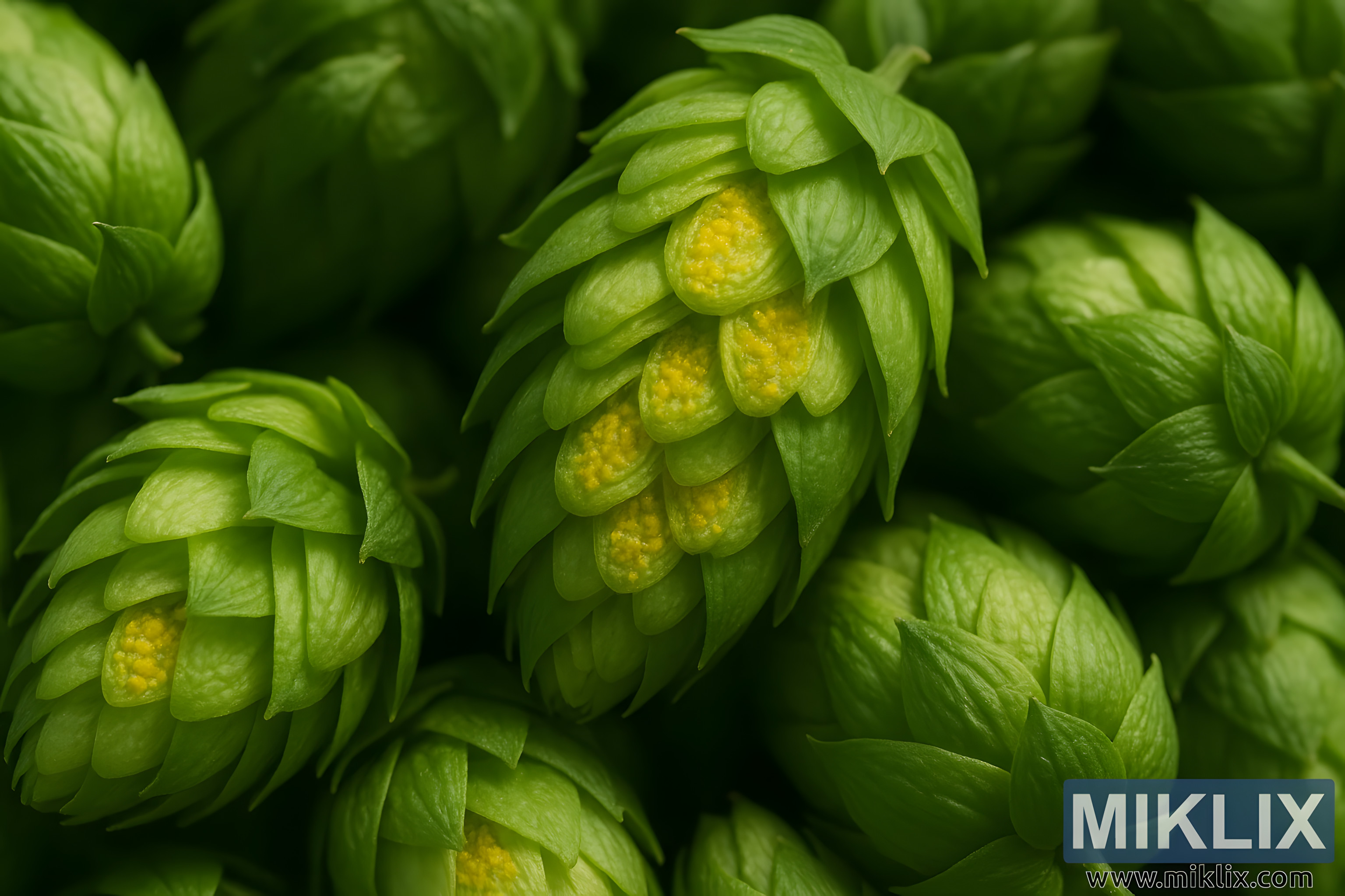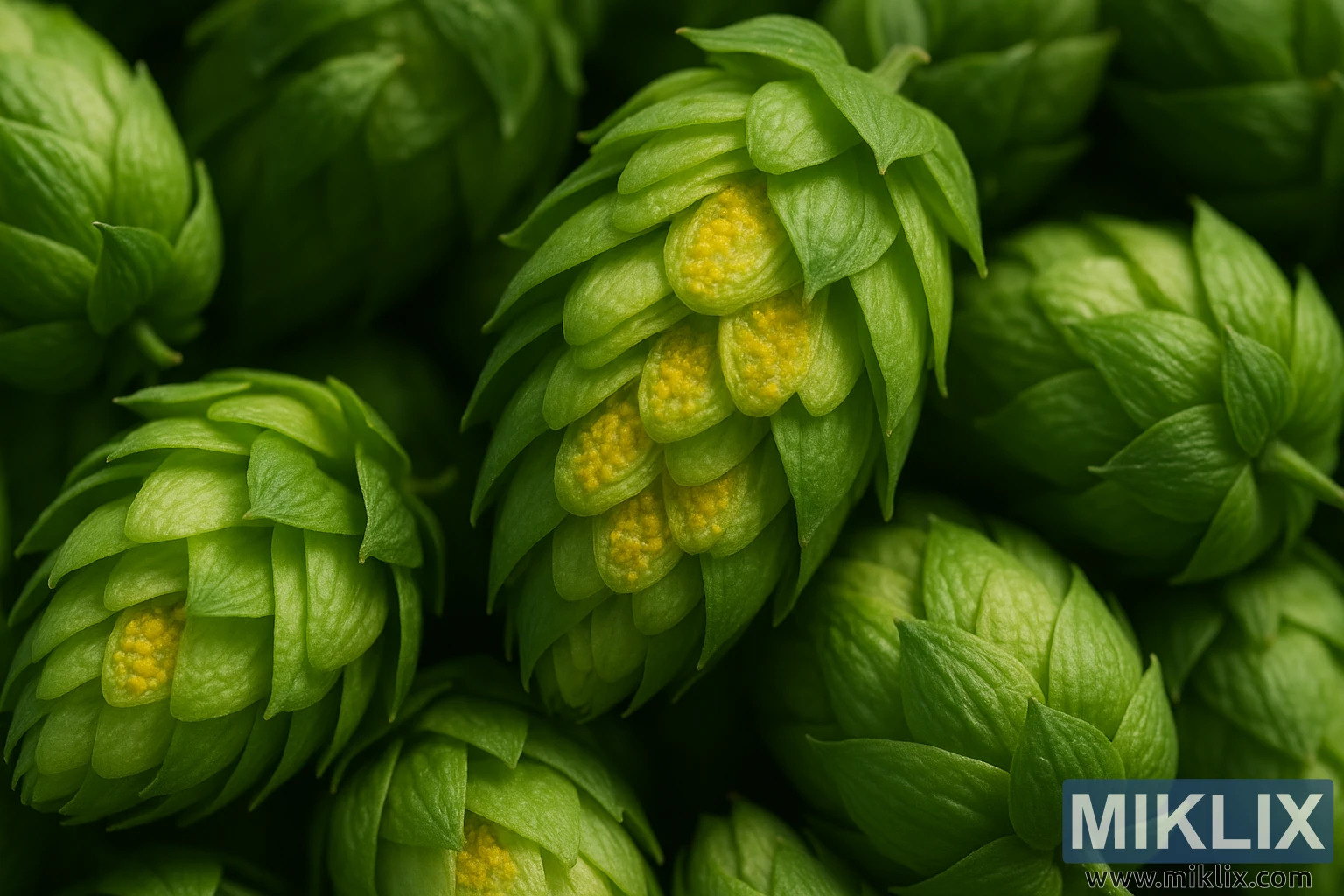 Close-up photo of fresh hop cones showcasing dense yellow lupulin glands and crisp green bracts in soft, diffused light, highlighting texture and abundance.