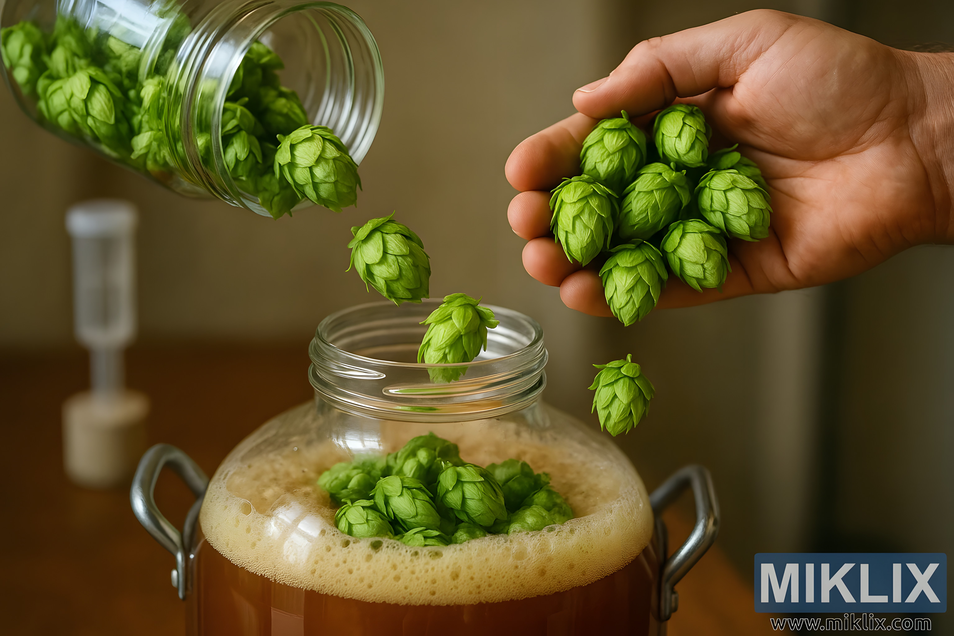 Homebrewer adds vibrant green hops into a foamy amber beer fermenter, capturing the rustic craft and motion of dry hopping.