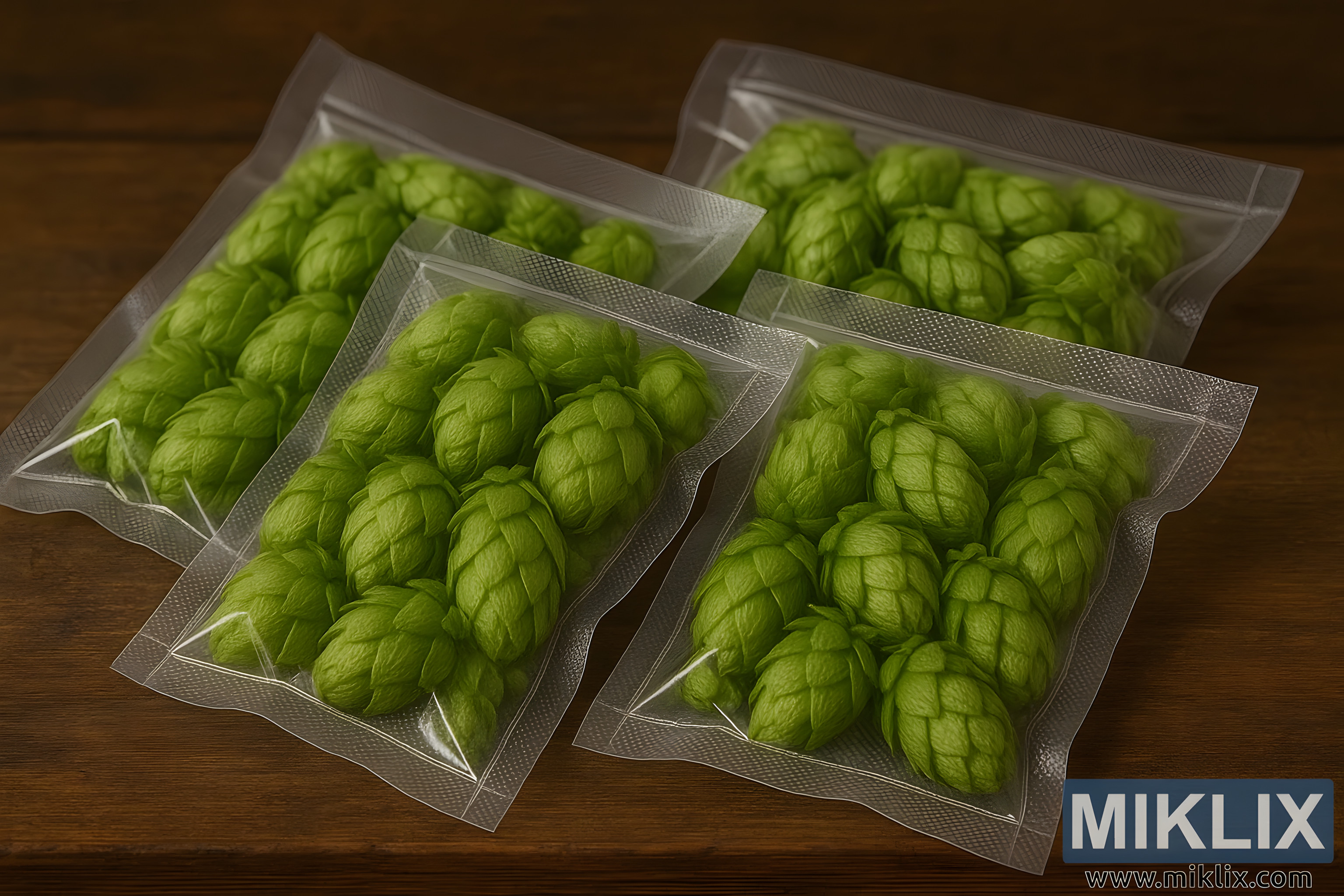 Four vacuum-sealed bags of vibrant green hop cones on rustic wood, highlighting freshness and proper storage for homebrewing.