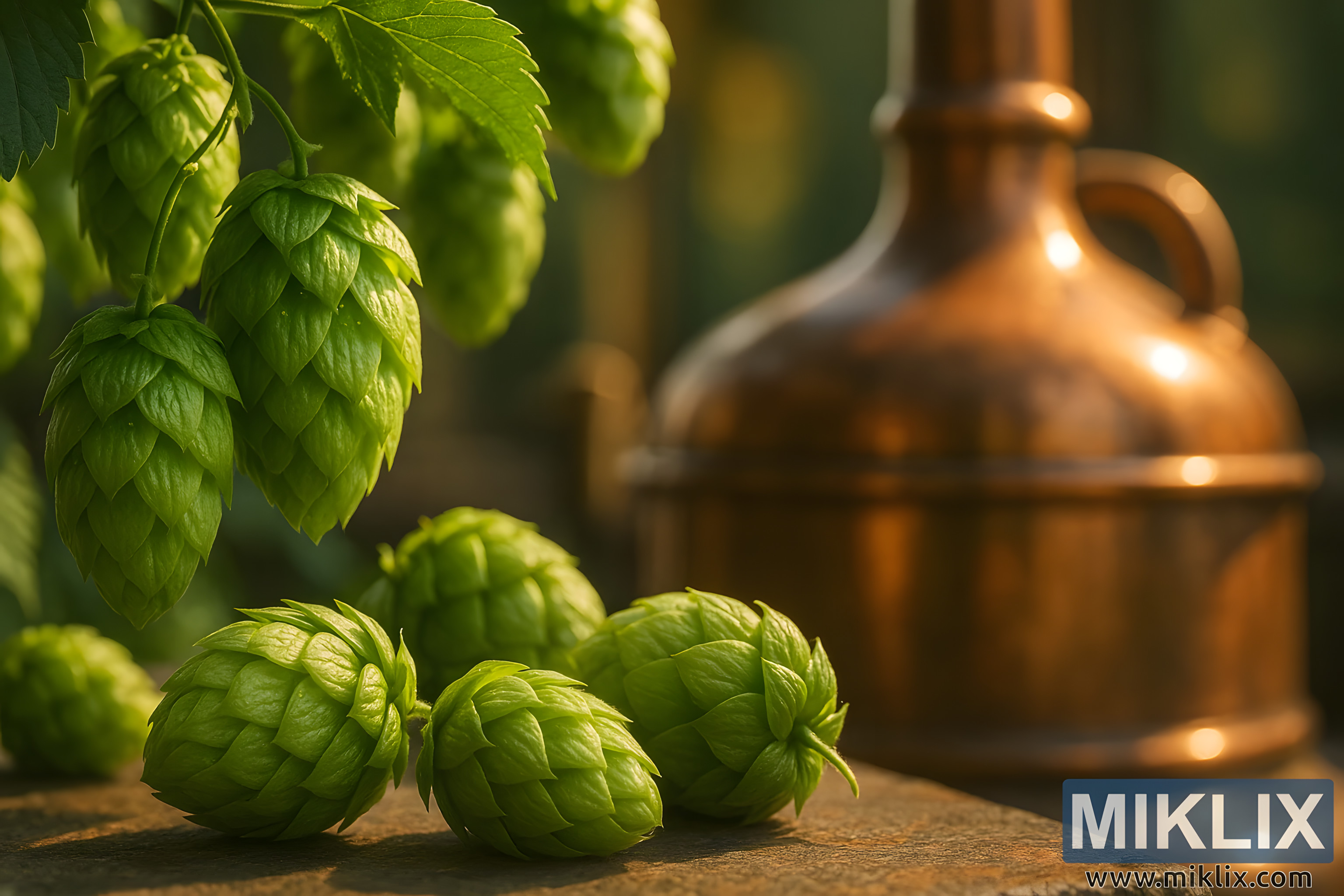 Fresh Lucan hops cascade before a copper brew kettle in golden light, showcasing lupulin detail and the craft of distinctive beer brewing.