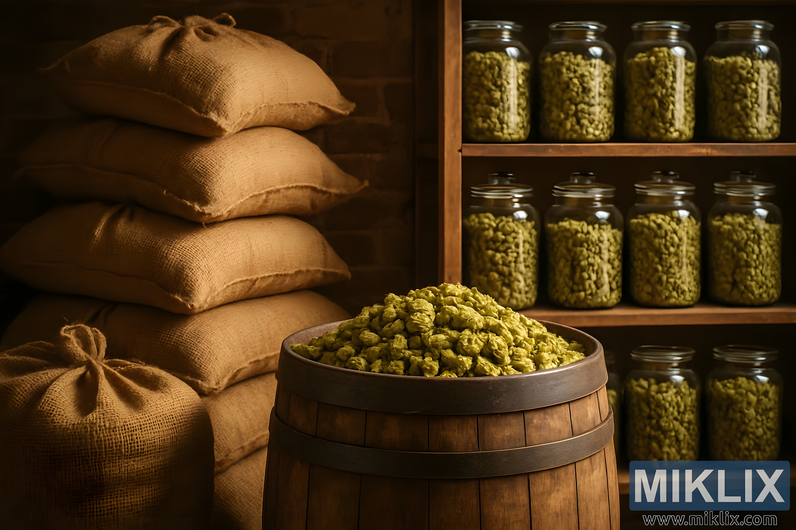 Burlap sacks, jars, and a barrel of dried hops in warm light against a rustic brick wall, showing traditional methods of preserving brewing hops.