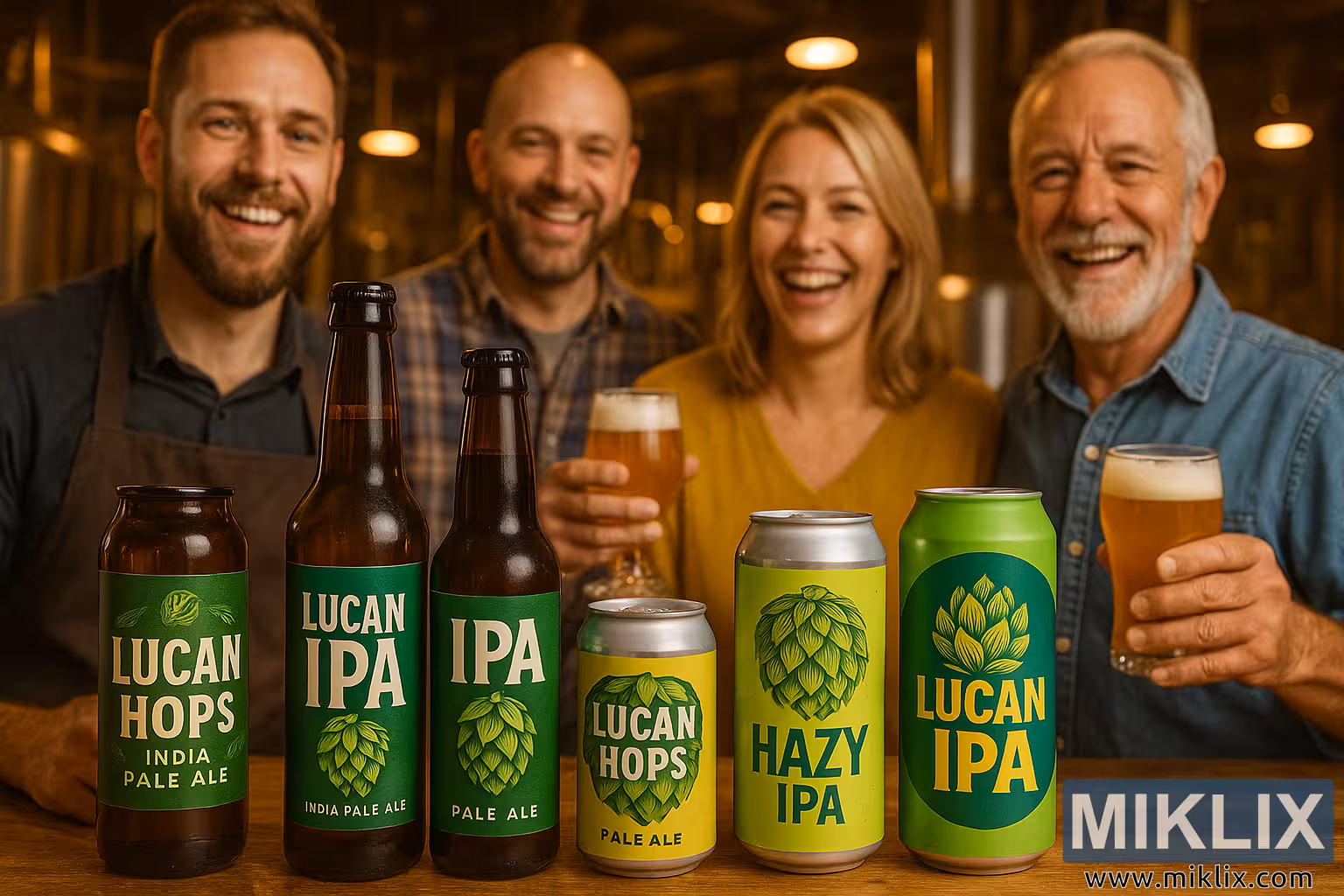 A vibrant collage of Lucan hops beers with brewers and happy customers in a warm brewery setting, celebrating their success and versatility.