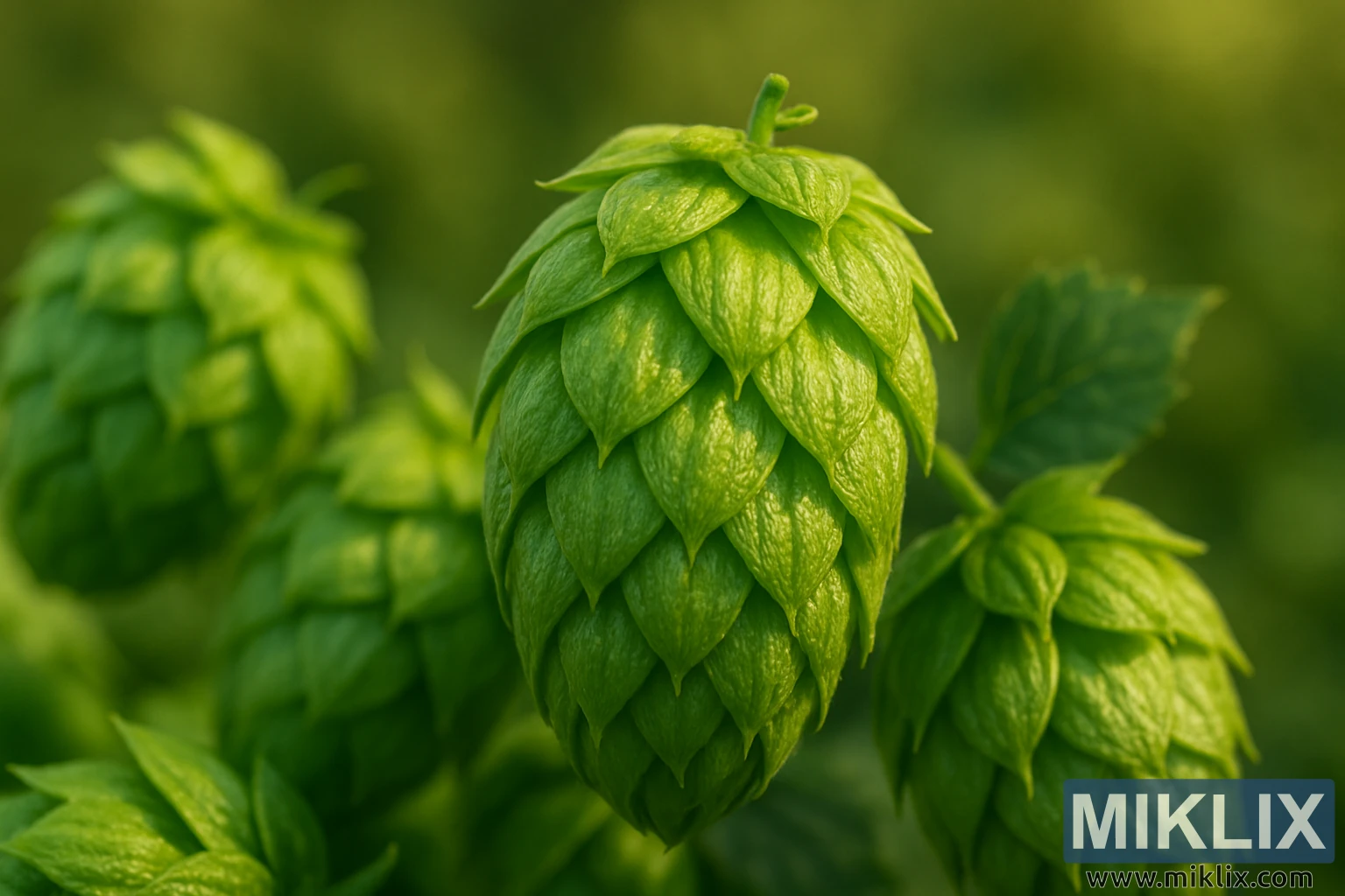 Around the main subject, other cones cluster slightly out of focus, their blurred presence providing balance and context. Together, they create a sense of abundance, reminding the viewer that while one cone is isolated in detail, it is part of a larger harvest, a collective yield of the bine. The soft-focus background, a wash of green tones, dissolves into abstraction, allowing the sharply defined cones to stand out with heightened prominence. The effect mimics the experience of walking through a hop yard on a bright summer afternoon, where the eye is drawn to the tactile intricacies of the nearest cone while the vastness of the field becomes a gentle blur.