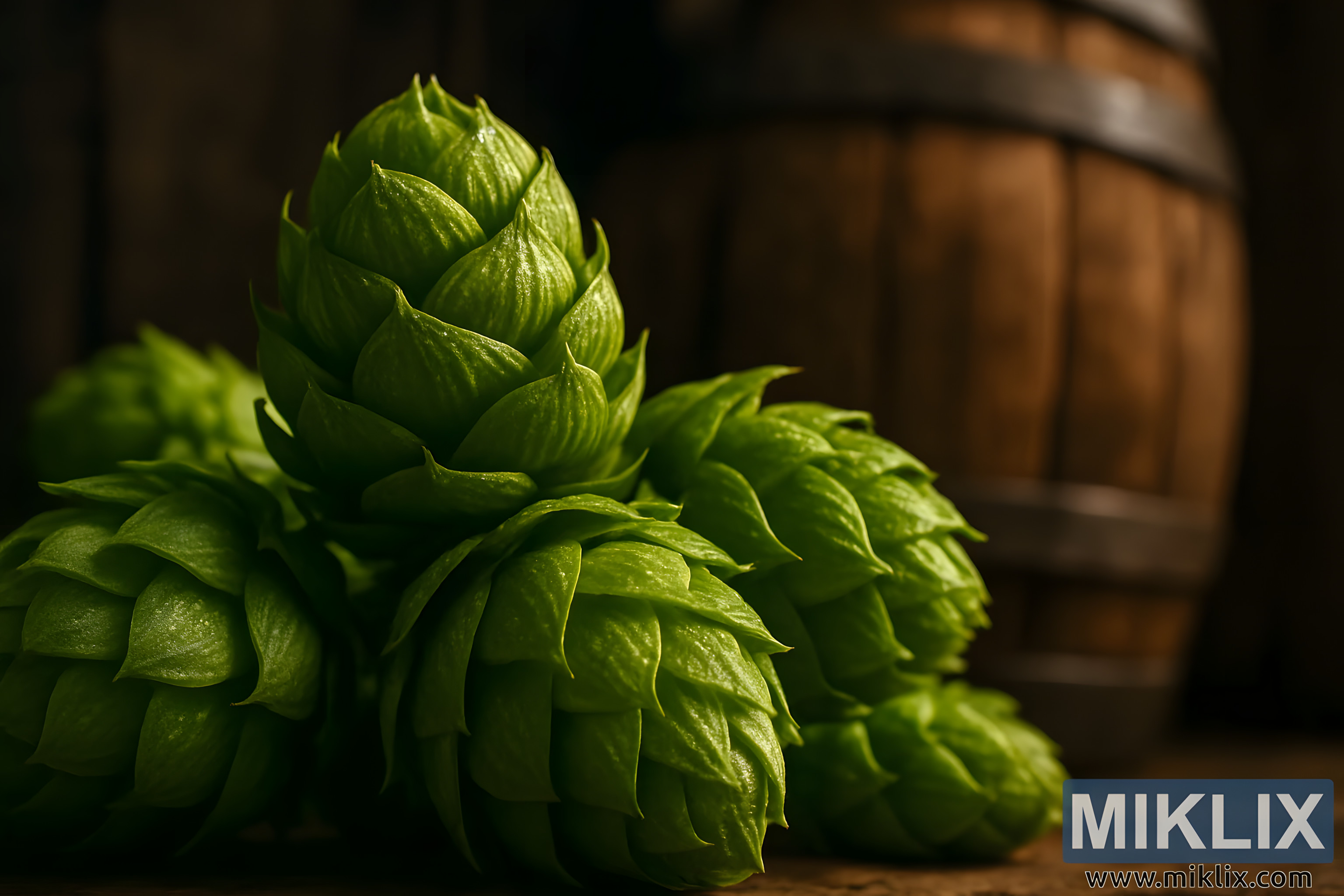 Close-up of vibrant Mosaic hop cones with glistening lupulin glands, set against a rustic wooden barrel, symbolizing artisanal beer brewing craftsmanship.