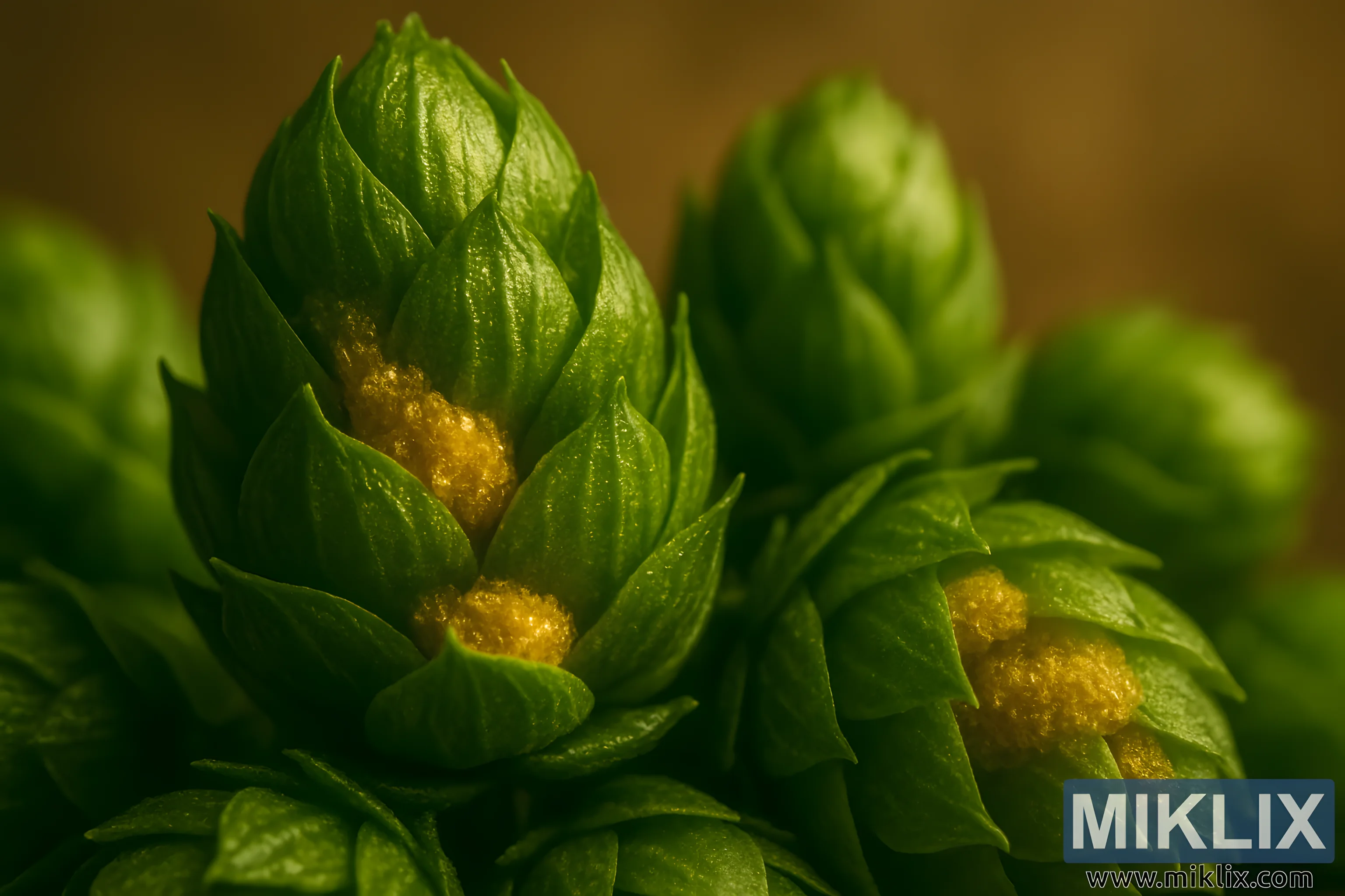 Macro photo of Mosaic hop cones with glistening lupulin glands, highlighting their tropical, pine, and citrus aroma under warm golden studio lighting.