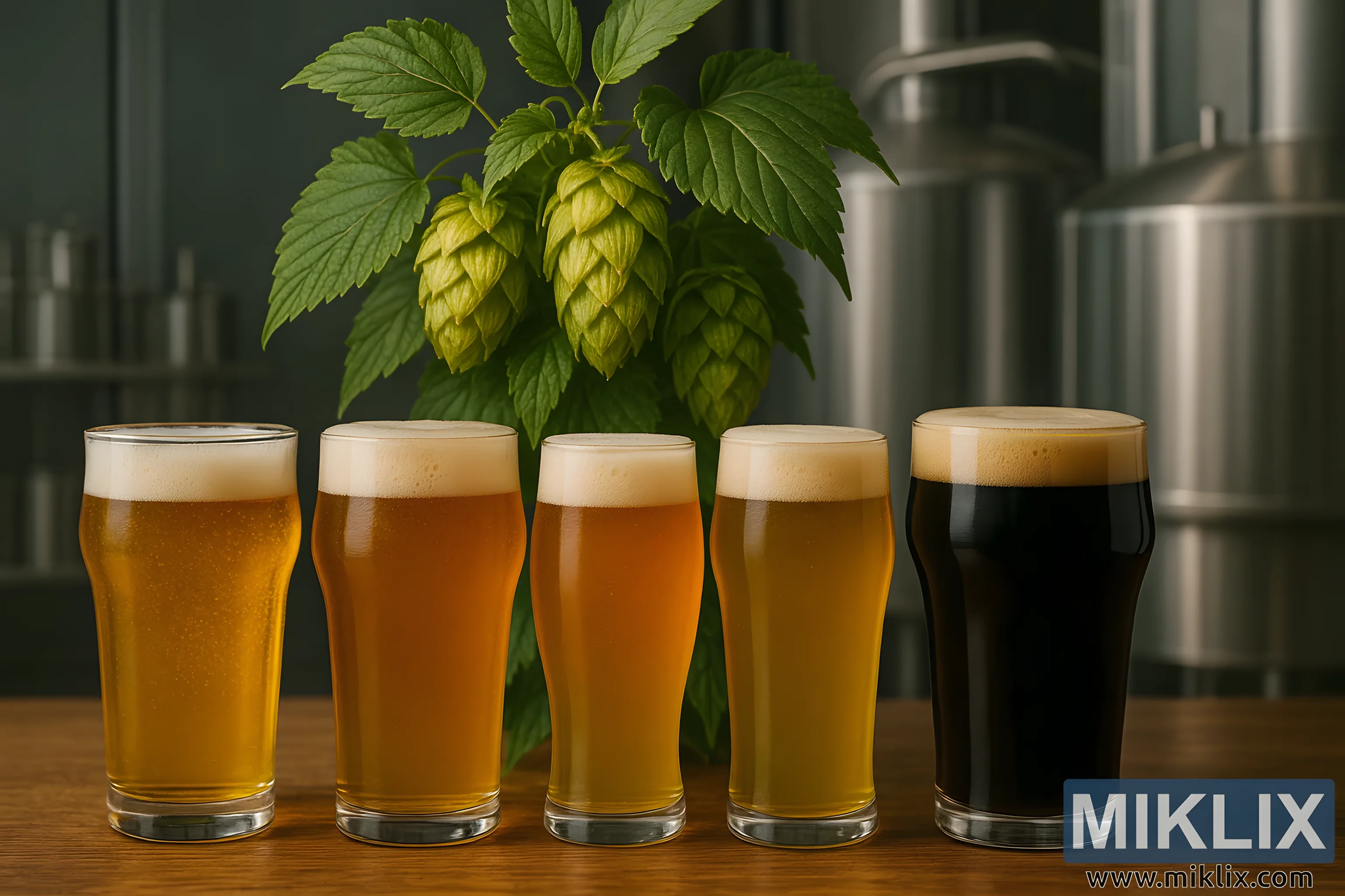 A flight of beers from lagers to IPAs and stouts with Mosaic hops, paired with lush hop bines and a sleek brewery backdrop, showcasing hop versatility.