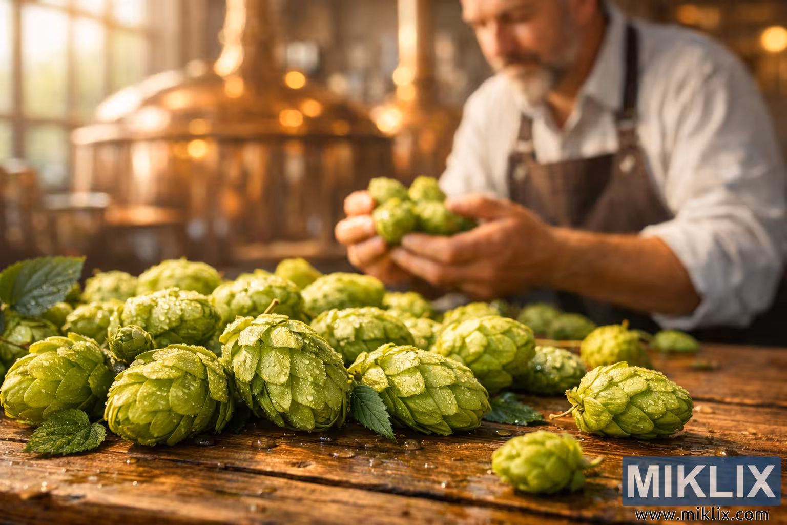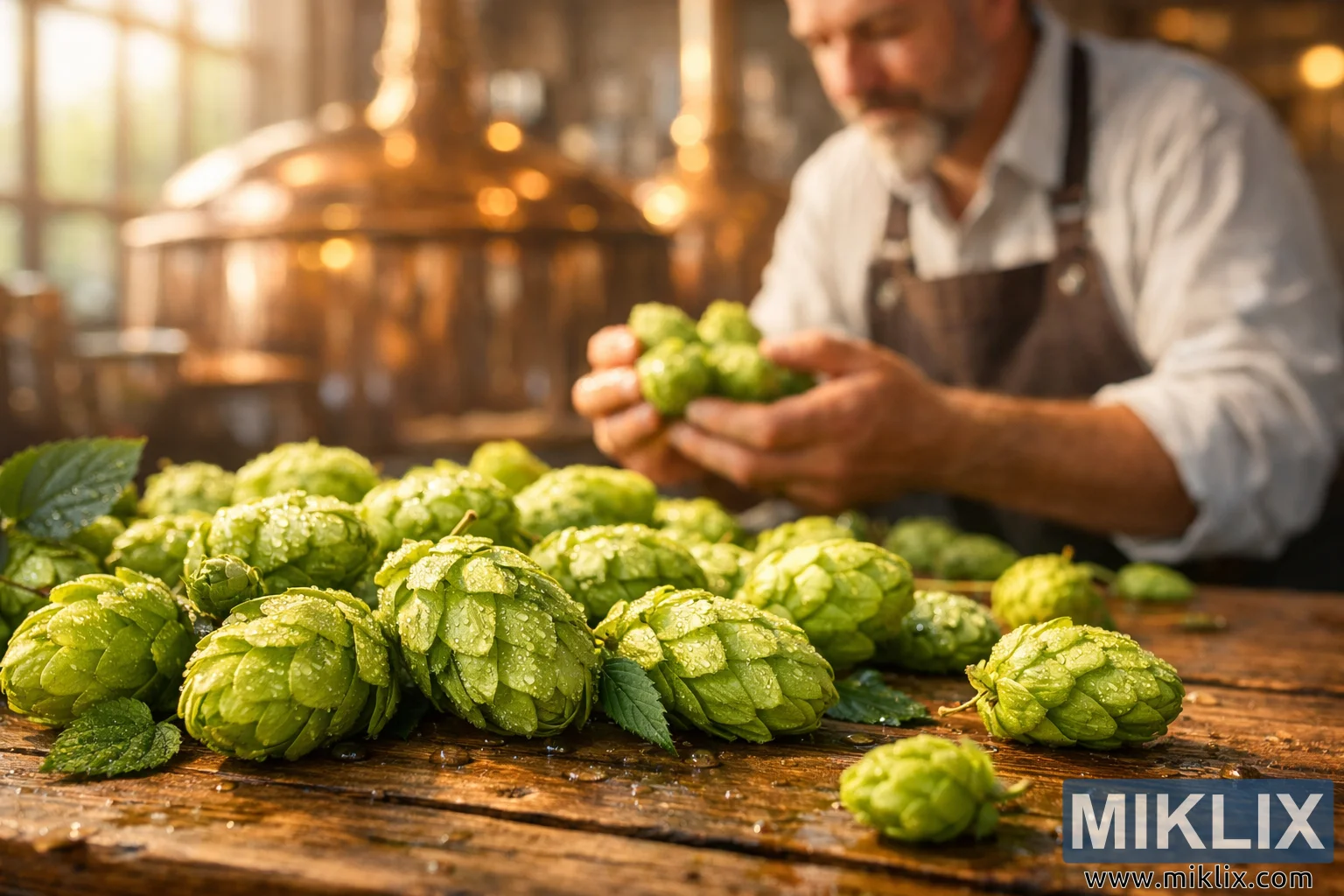 A warm, detailed brewery scene showcasing fresh Nadwislanska hop cones on a wooden table, an artisan brewer at work, and copper kettles glowing in natural morning light.