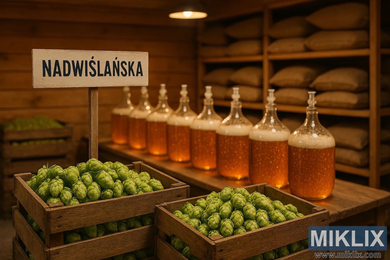 A warm, industrious hop storage facility featuring Nadwiślańska hops, golden beer in glass vessels, and neatly stacked dried hops in a cozy wooden interior.