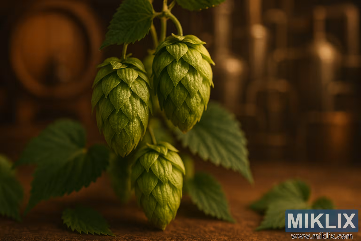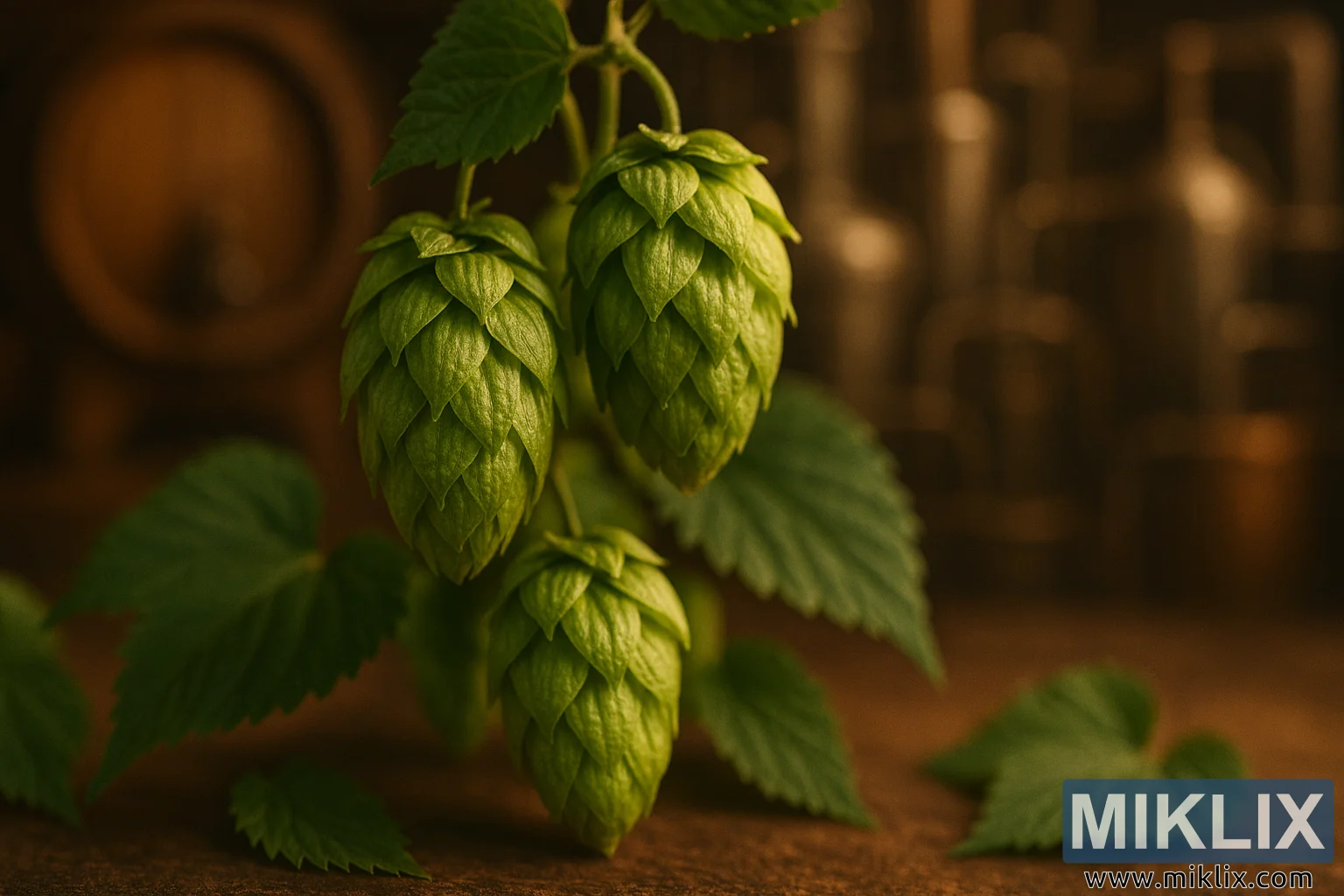 The background evokes a rustic brewing environment, with hints of wooden barrels and aged brewing equipment rendered in warm, earthy tones. These elements are intentionally out of focus, creating a gentle bokeh effect that contrasts with the sharp foreground and reinforces the image’s depth. The interplay of light and shadow across the cones and leaves adds dimensionality and warmth, suggesting a late afternoon or early evening ambiance typical of traditional brewing spaces.