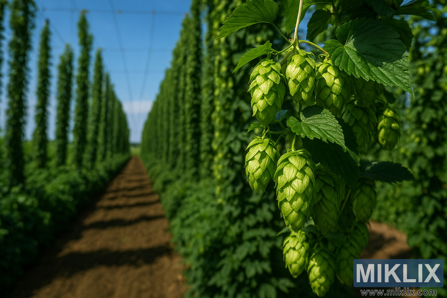 High-resolution landscape photo of Nordgaard hops: crisp foreground cones, orderly tall trellises, vivid greens under clear blue sky.