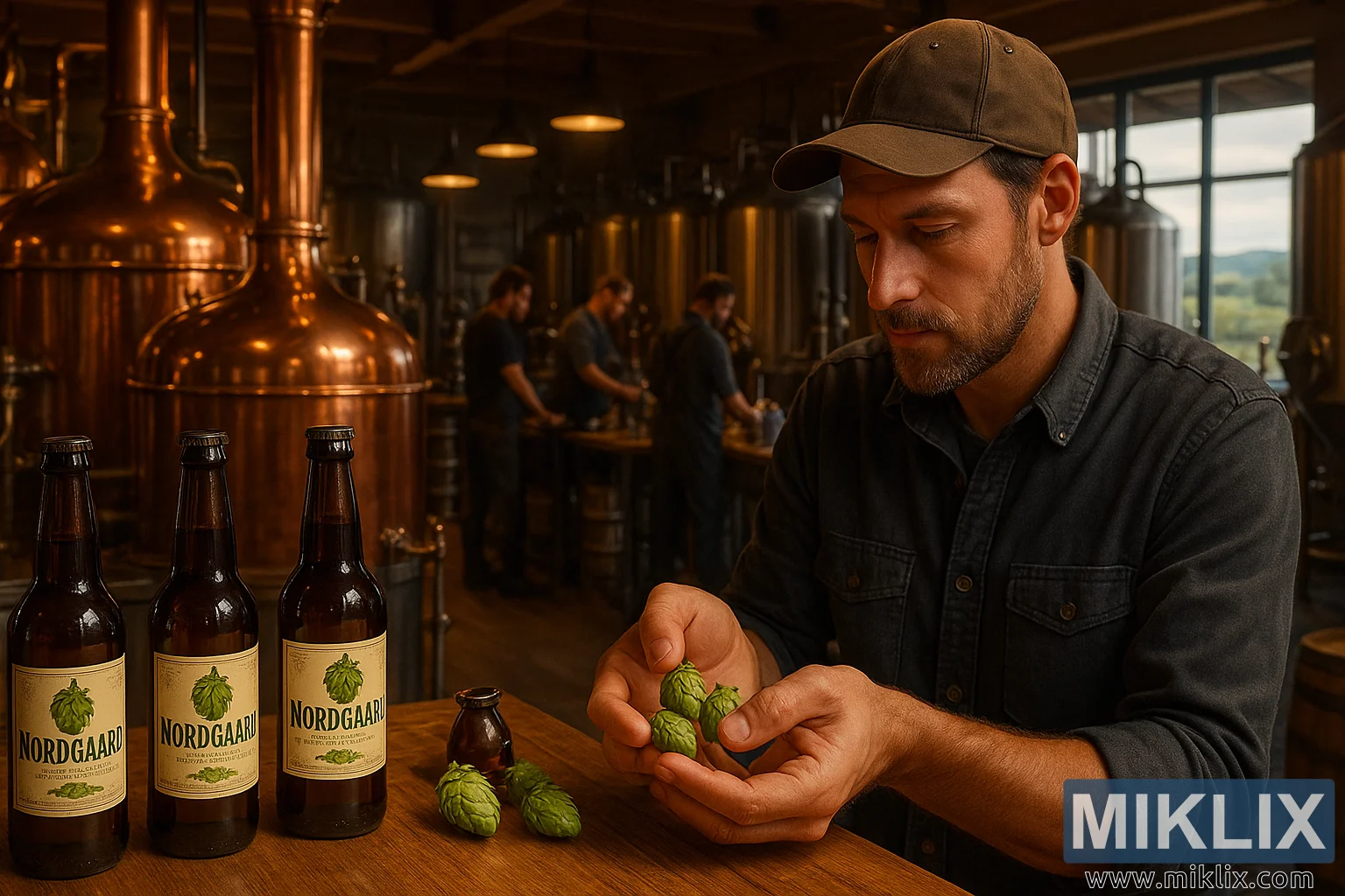 A cozy brewery where a brewmaster inspects Nordgaard hops, workers brew with copper kettles, and finished beers showcase this celebrated hop variety.