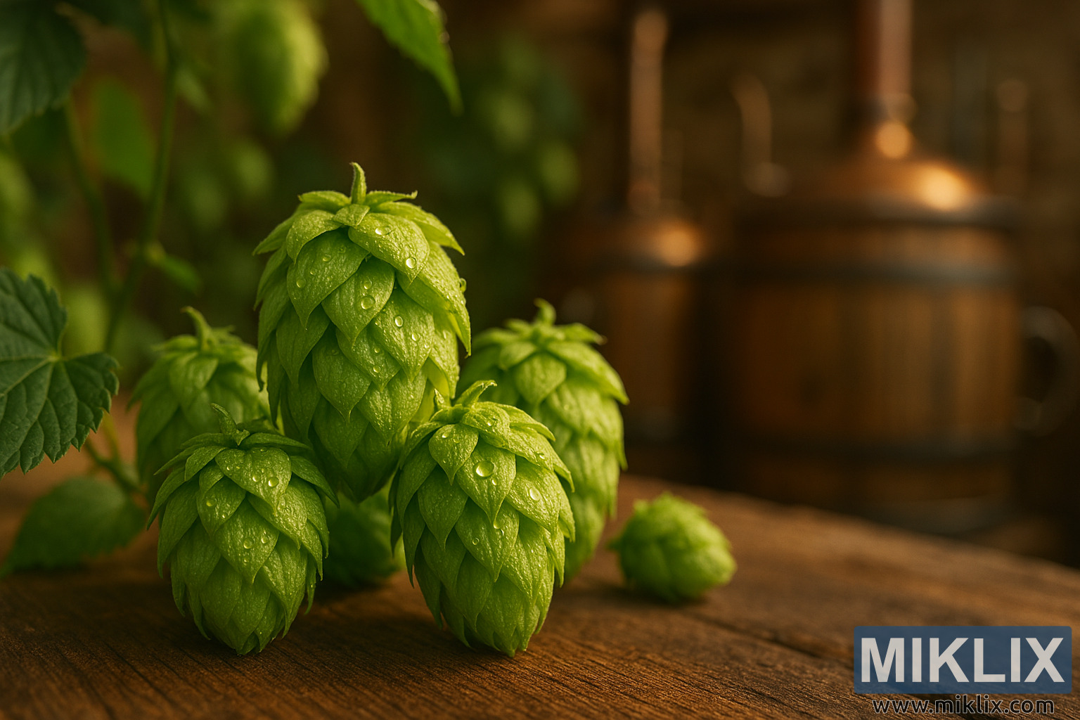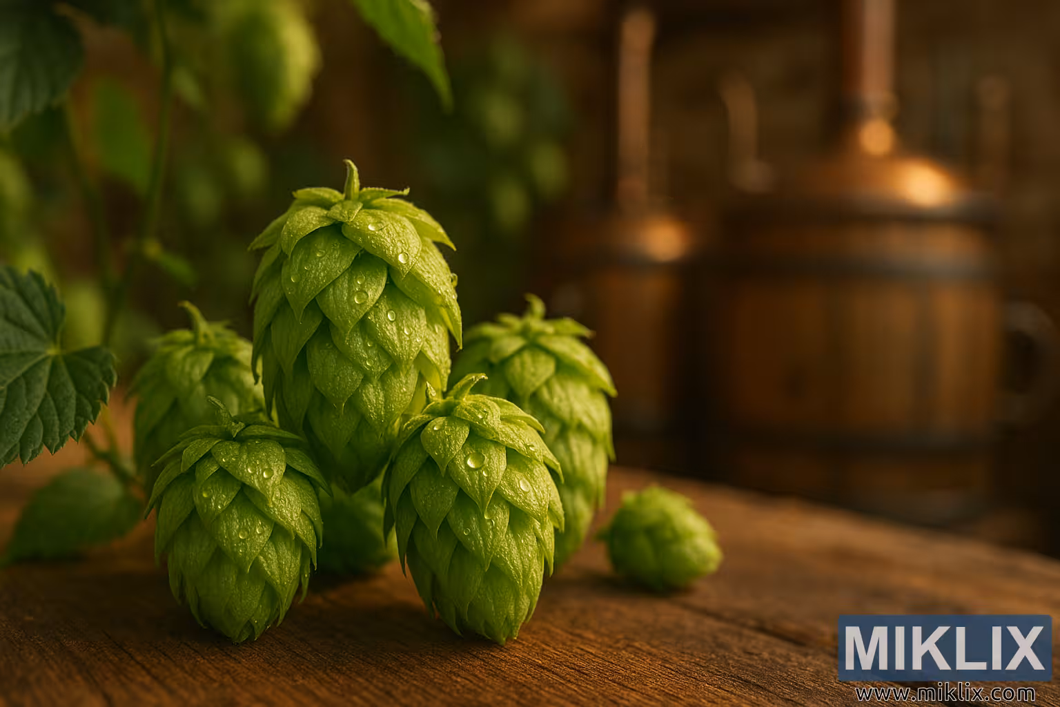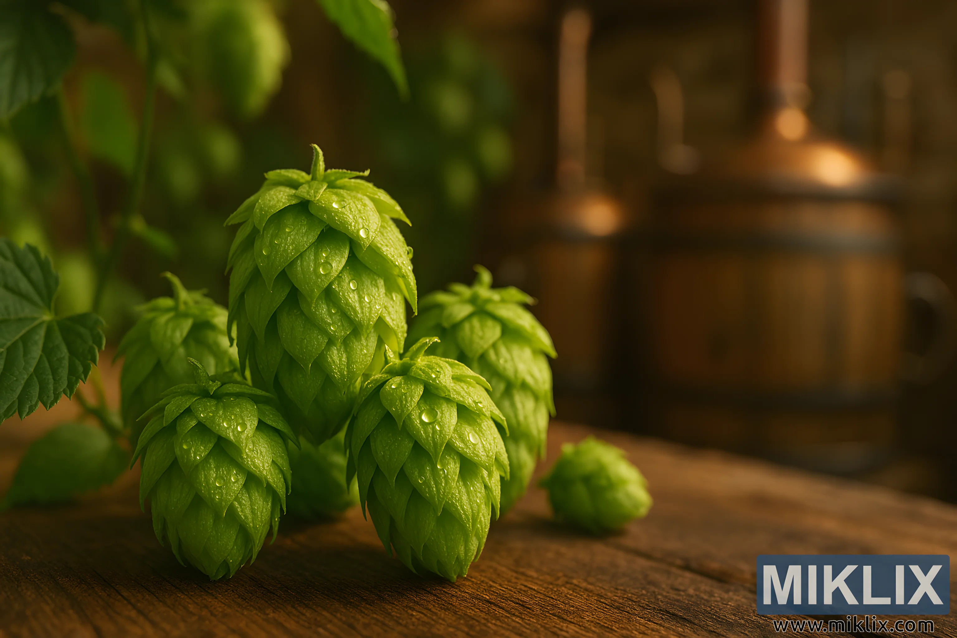 In the background, the scene shifts to a rustic brewery interior. A large wooden barrel with metal bands sits off to the right, partially obscured by the soft blur of shallow depth of field. Behind it, a copper brewing vessel glows with warm tones, its curved silhouette hinting at traditional brewing methods. The background elements are intentionally out of focus, allowing the viewer’s attention to remain on the hops while still providing contextual richness.