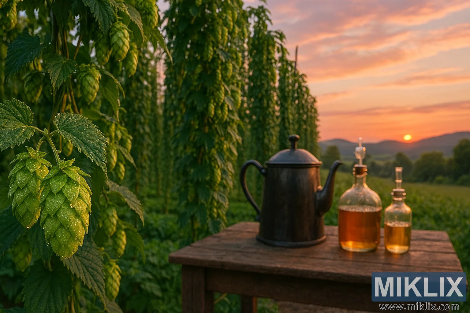 A serene hop field at sunset featuring dew-covered Northern Brewer hops, rustic brewing gear, and rolling hills bathed in warm light.