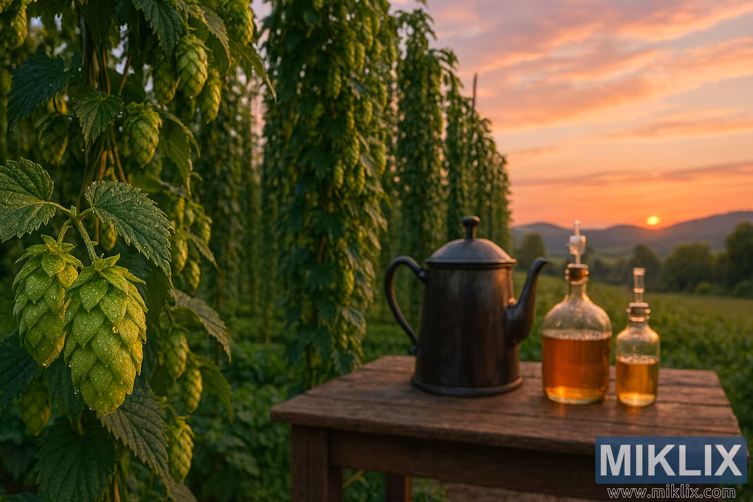 The composition balances crisp botanical detail with atmospheric warmth. The lighting highlights the hop cones and brewing equipment while allowing the background to soften into a tranquil blur. The overall mood is inviting and peaceful, evoking the artisanal spirit of brewing and the natural beauty of the countryside.