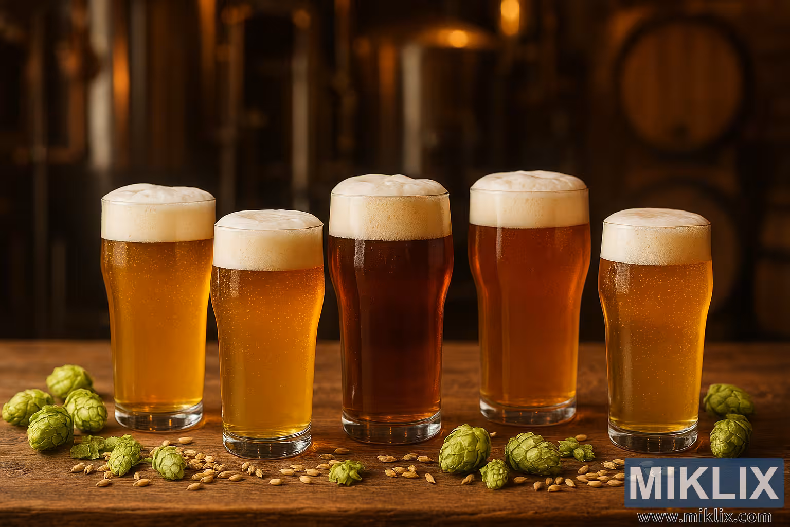 Scattered across the table are fresh green hop cones and golden barley grains, artfully arranged to evoke the brewing process. The hop cones are plump and textured, with overlapping scales and a vibrant green color, while the barley grains glisten subtly under the soft lighting. The table’s surface is richly grained and slightly worn, adding to the rustic charm and authenticity of the scene.