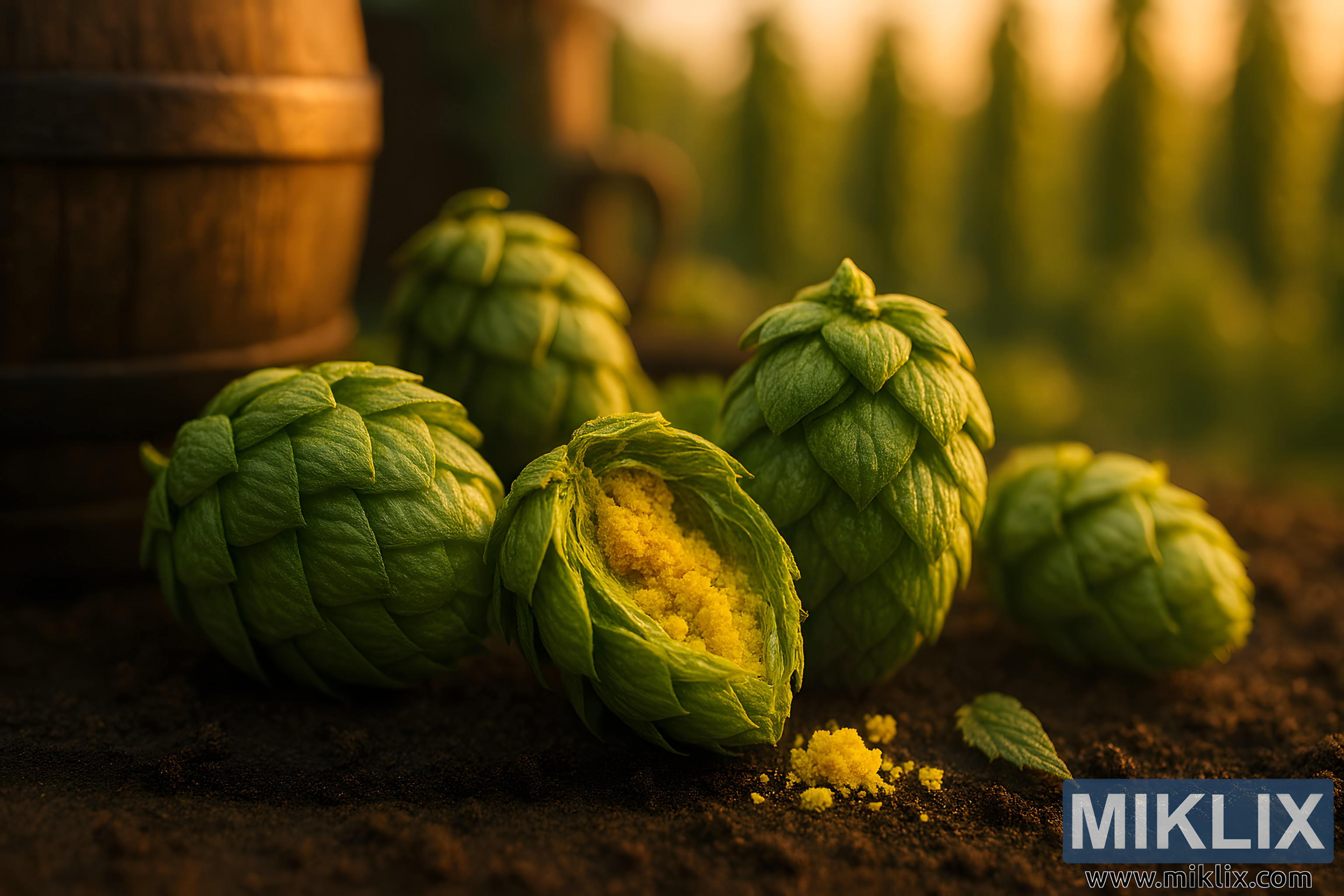This high-resolution landscape photograph presents an immersive, tactile view of Northern Brewer hops at the heart of the brewing process. In the foreground, several hop cones lie on dark, richly textured soil, their papery green bracts sharply defined and layered with natural complexity. One cone is partially split open, revealing a dense concentration of bright yellow lupulin glands nestled between the folds. The lupulin appears resinous and granular, almost crystalline, suggesting its aromatic intensity and bittering potential. Fine specks of yellow lupulin dust are scattered across the soil, enhancing the sense of freshness and physical presence. Subtle variations in green tones run through the hop cones, from deep, shadowed greens to lighter, sunlit edges touched by warm golden-hour light. The soil beneath them is earthy and uneven, with small clumps and particles that ground the scene in agricultural realism. In the softly blurred middle ground, an aged wooden brewing barrel emerges, its weathered staves and visible grain evoking traditional craftsmanship and brewing heritage. The background dissolves into a verdant hop field rendered in gentle soft focus, where tall hop bines and leafy foliage catch the low, warm sunlight. Golden-hour illumination filters through the leaves, creating a delicate bokeh and casting inviting shadows that add depth and atmosphere. A shallow depth of field isolates the exposed lupulin as the clear focal point, while the surrounding elements provide context without distraction. The overall mood is earthy, natural, and quietly celebratory, capturing the essence of hops as both a living crop and a vital ingredient in beer brewing, free from text or artificial elements.