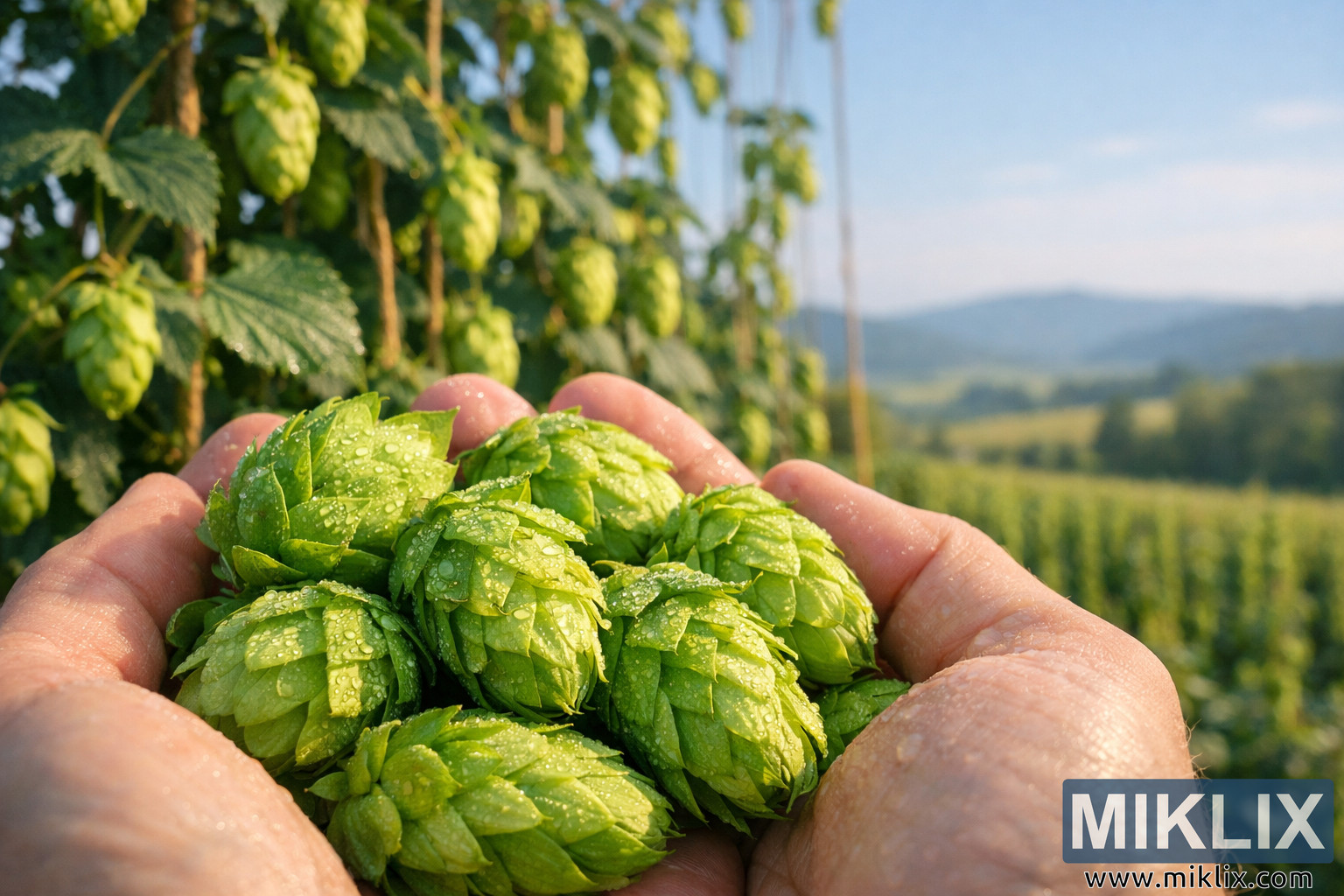 A warm, close-up landscape photo of dew-covered Nugget hops held in hand, with lush hop bines, rolling hills, and a serene blue sky in the background.