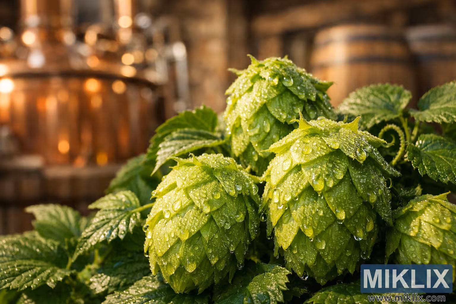 In the background, rendered in a pleasing soft focus, a rustic brewery environment provides context and atmosphere. Warm copper brewing kettles reflect the ambient light with a subtle glow, while wooden barrels stand nearby, their rounded forms and aged textures evoking tradition and craftsmanship. The blurred brewery setting contrasts with the crisp detail of the hops, reinforcing their central importance while situating them within the authentic world of brewing. The copper tones harmonize with the vibrant greens, creating a balanced palette of earthy and metallic hues.