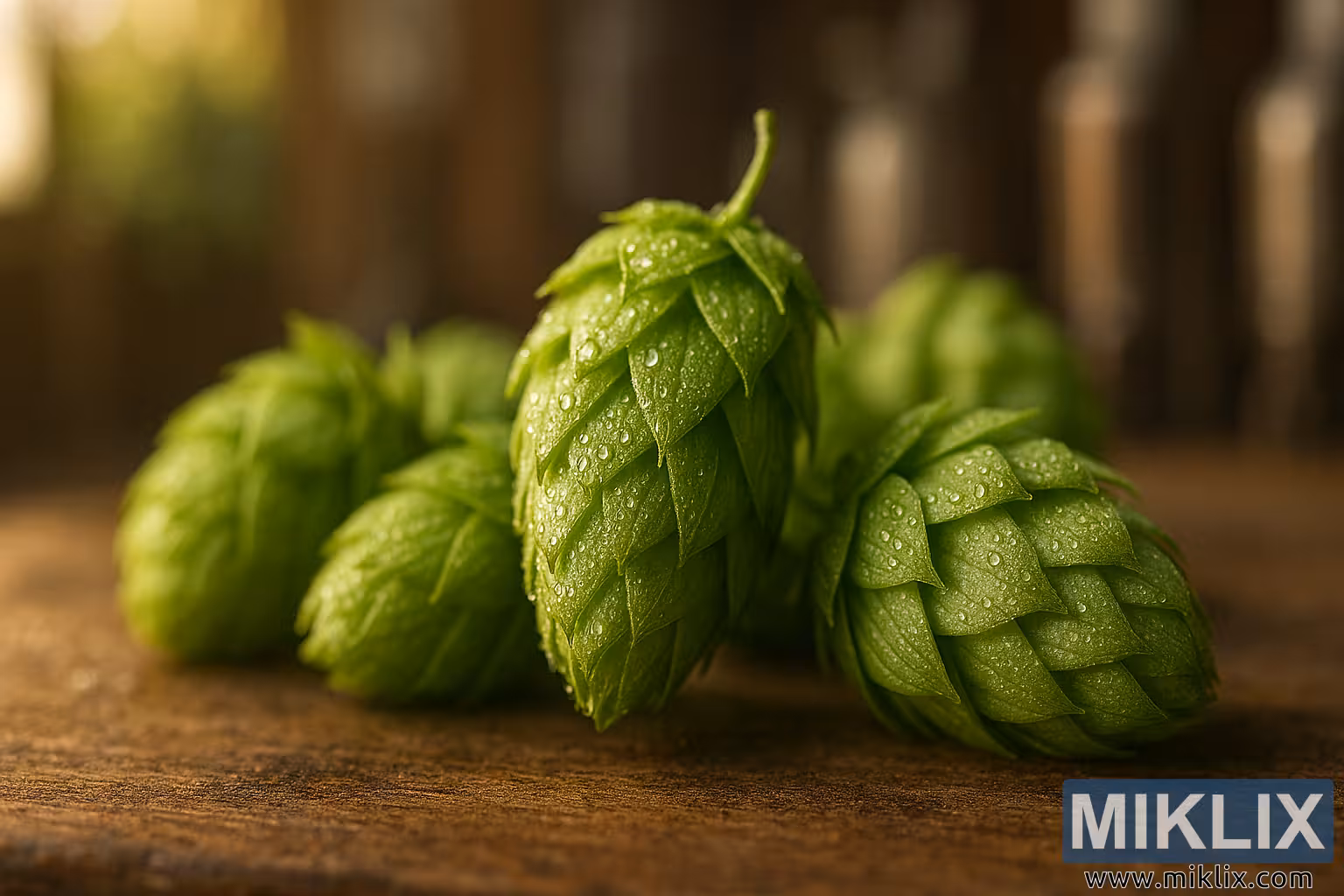 A vibrant close-up of dew-covered Orbit hops on rustic wood, softly lit with blurred brewery equipment in the background.