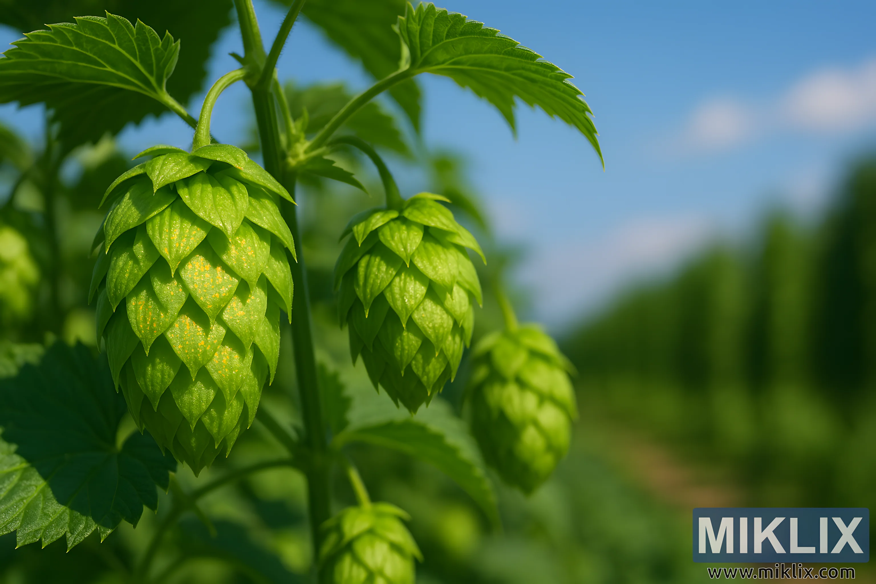 The background is softly blurred, suggesting a tranquil hop farm stretching into the distance beneath a clear blue sky. Rows of hops plants fade gently into the horizon, evoking a sense of scale and serenity. The lighting is natural and evenly diffused, casting gentle shadows and highlighting the vivid greens and golden tones without harsh contrasts.