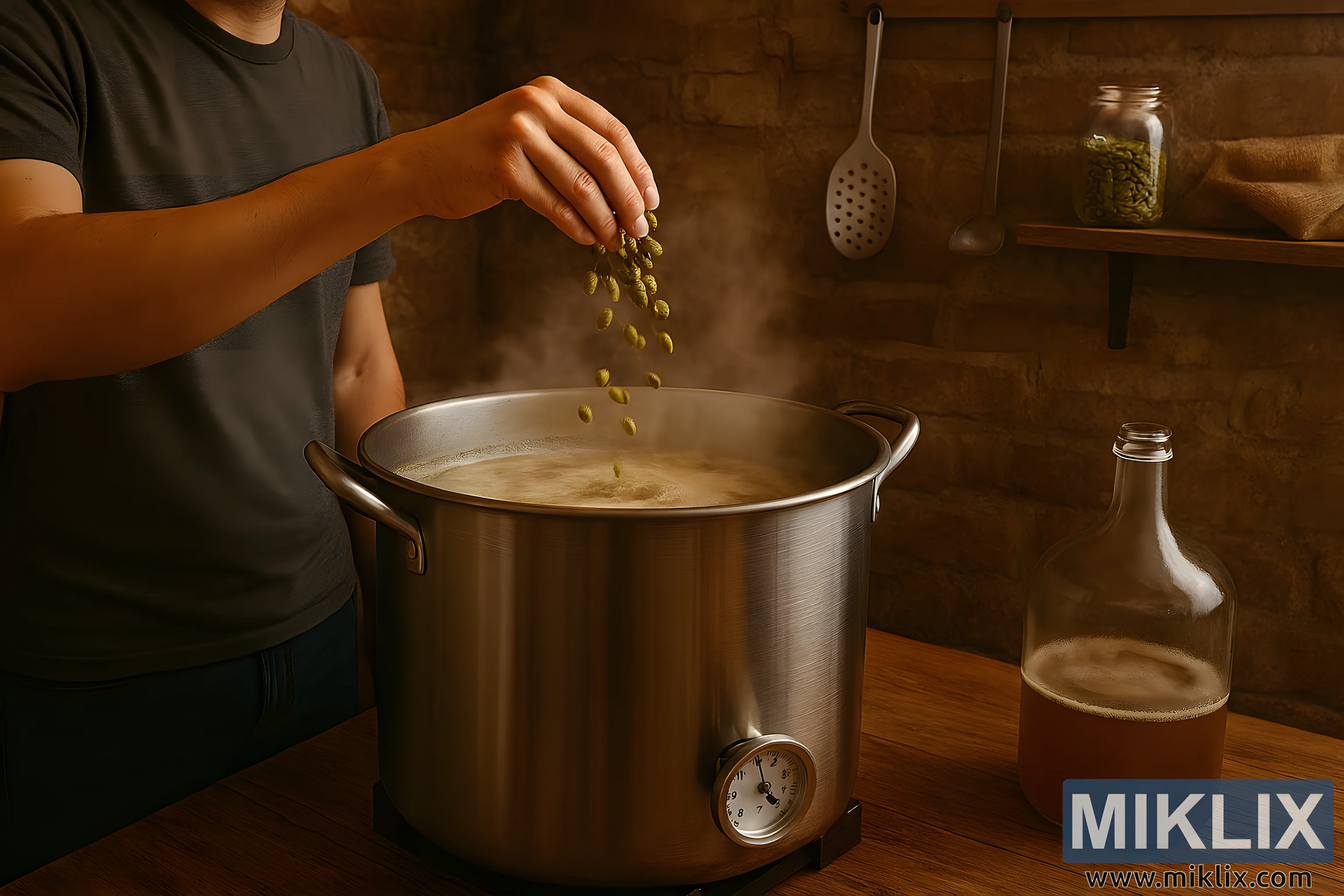 Photorealistic image of a homebrewer adding hops to a boiling brew kettle in a rustic homebrewing space, with steam rising and brewing tools in the background.
