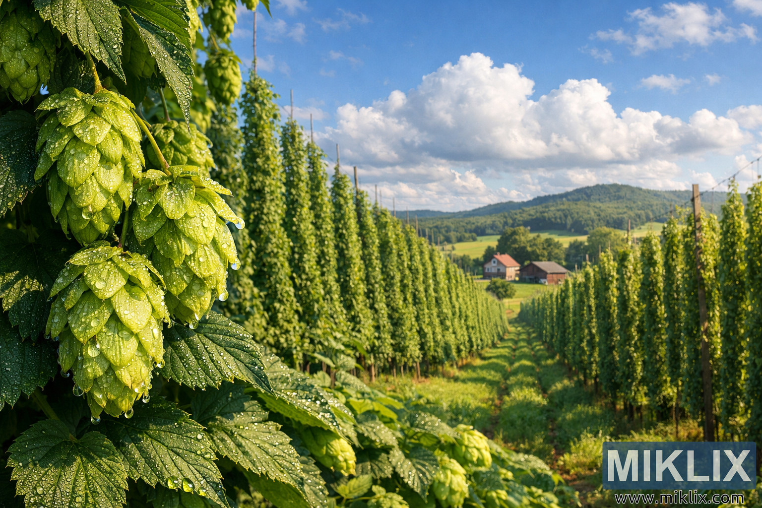 A high-resolution landscape photograph of vibrant Orion hop fields with dew-kissed cones, expansive trellises, rolling hills, and a peaceful farmhouse beneath a bright blue sky.