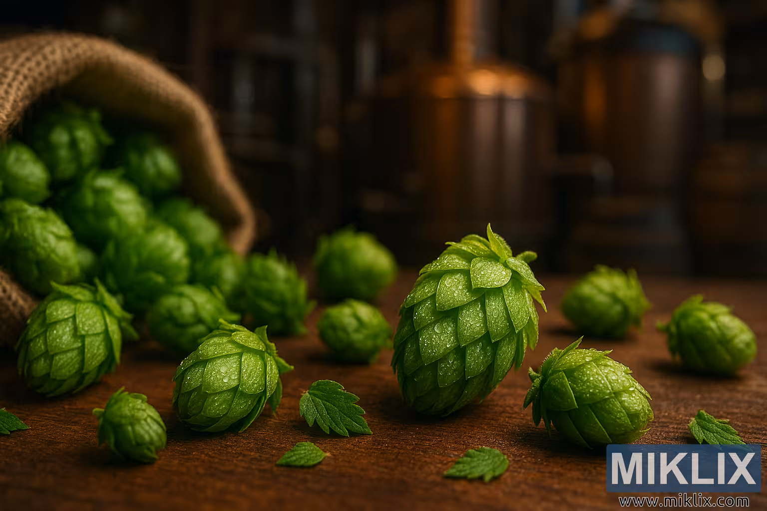 To the left, a coarse burlap sack spills additional hops onto the table, its fibrous texture contrasting with the smooth, moist surfaces of the cones. This element introduces a rustic, tactile quality that hints at the brewing process and the agricultural origins of the hops. The sack’s placement and partial fill suggest recent harvesting or preparation for brewing, adding narrative depth to the composition.