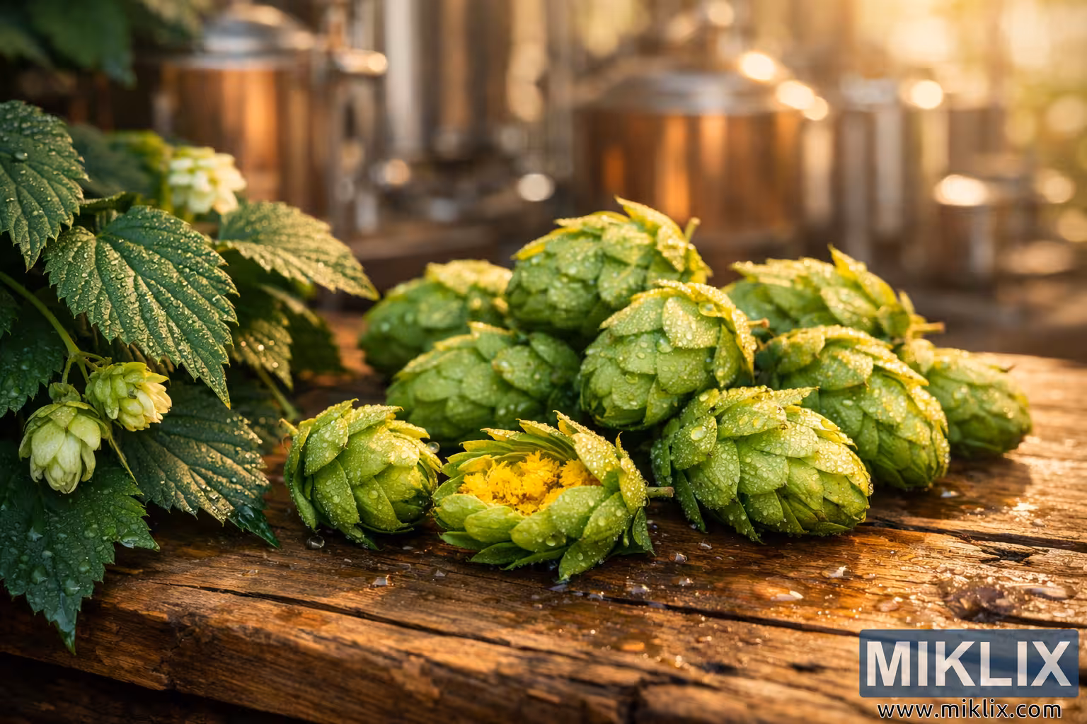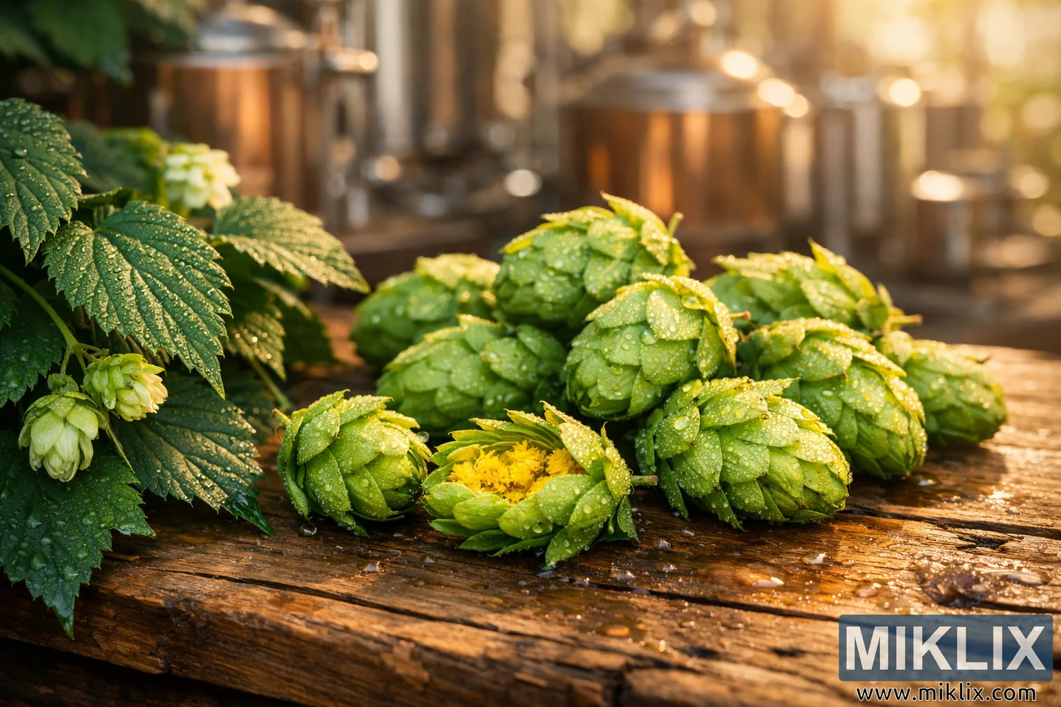 A high-resolution landscape photograph showcasing vibrant Pacifica hops with golden lupulin and morning dew, arranged on a rustic wooden table against a softly blurred brewery backdrop.