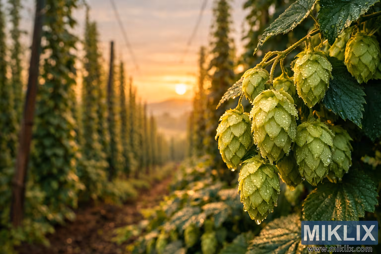 Low-angle golden hour photograph of vibrant Pacifica hops covered in morning dew, set in a lush hop field with trellised rows and a warm, glowing sunset horizon.
