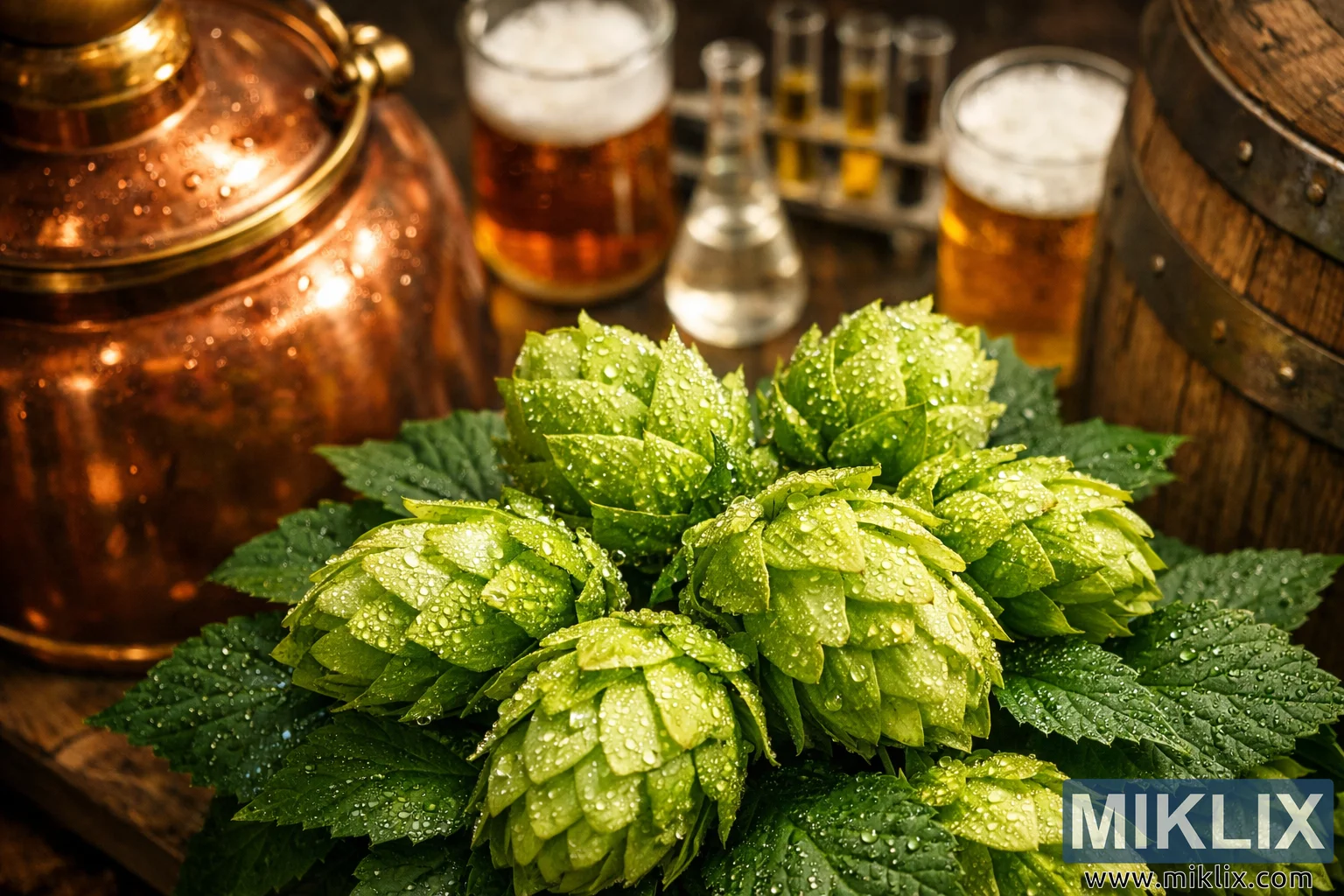 Image: Dew-Kissed Pacifica Hops in a Warm Brewing Laboratory
