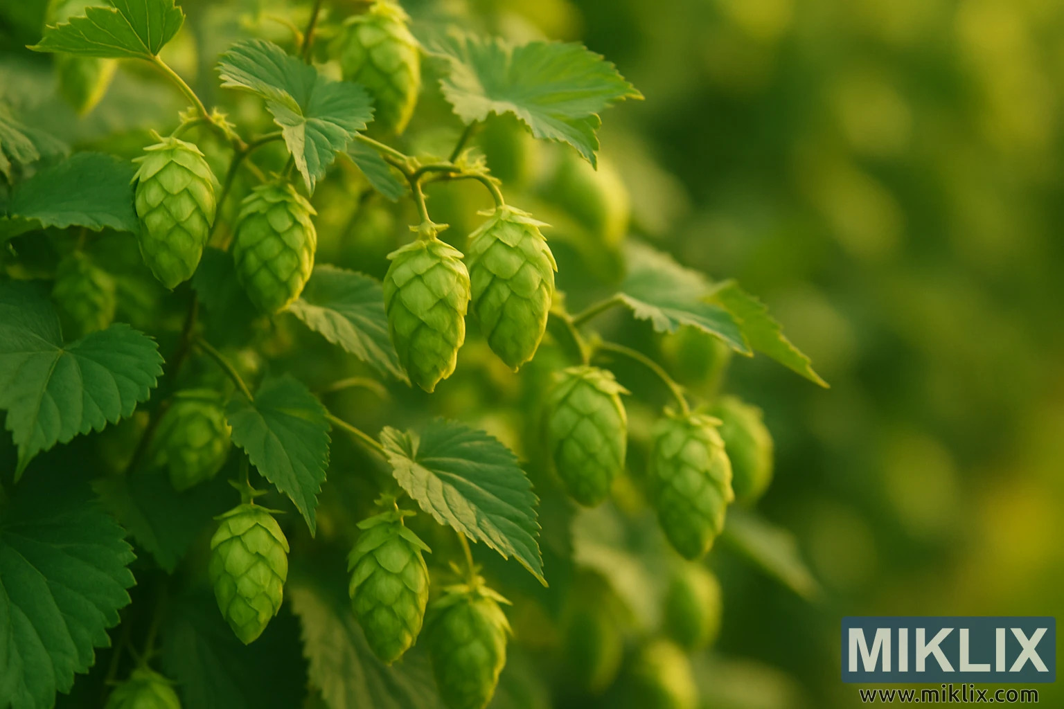 Image: Close-Up of Lush Riwaka Hop Cones in Golden Light