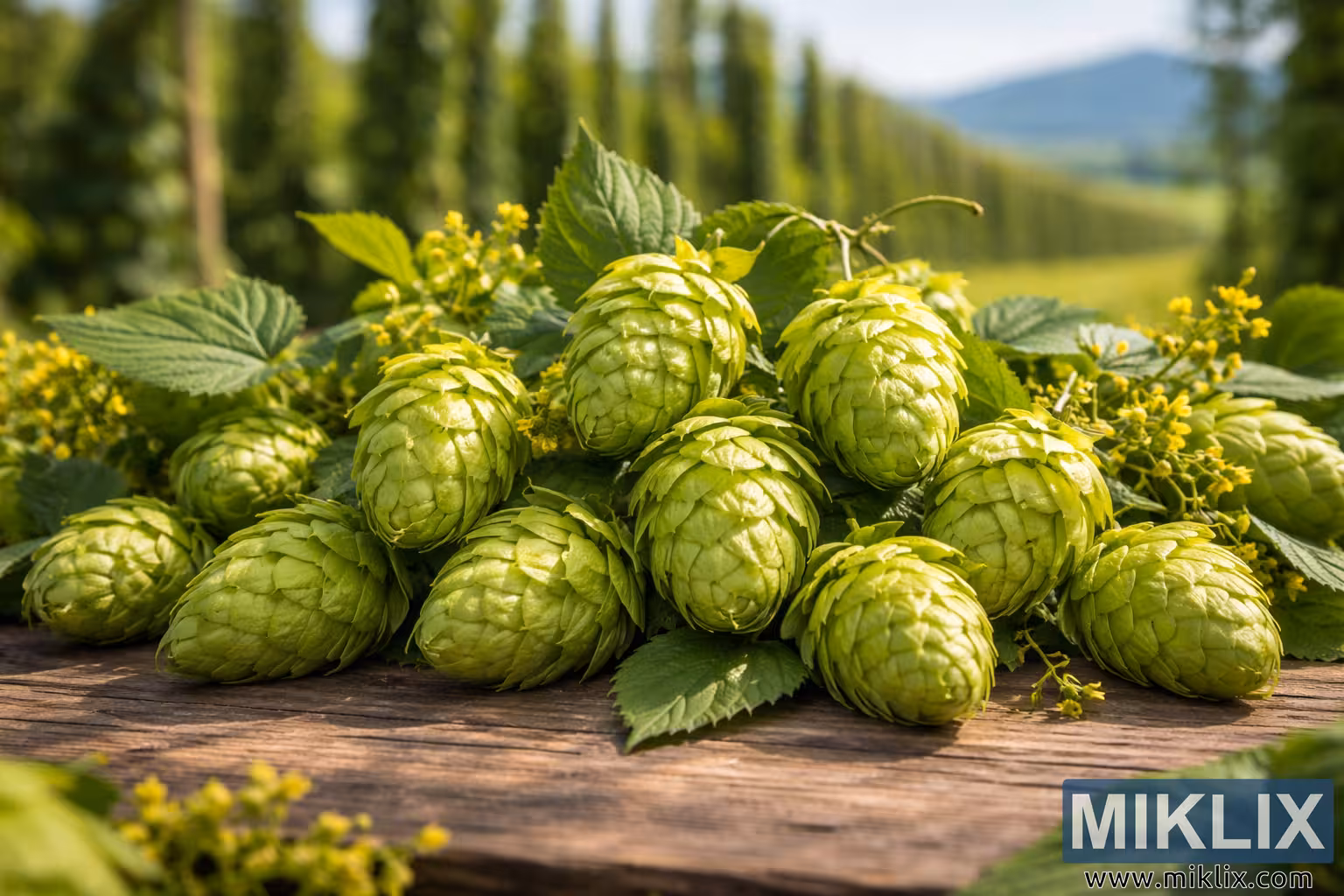 A detailed close-up photograph of vibrant green Santiam hops arranged on a rustic wooden table, illuminated by soft natural sunlight with a blurred hop farm landscape in the background.