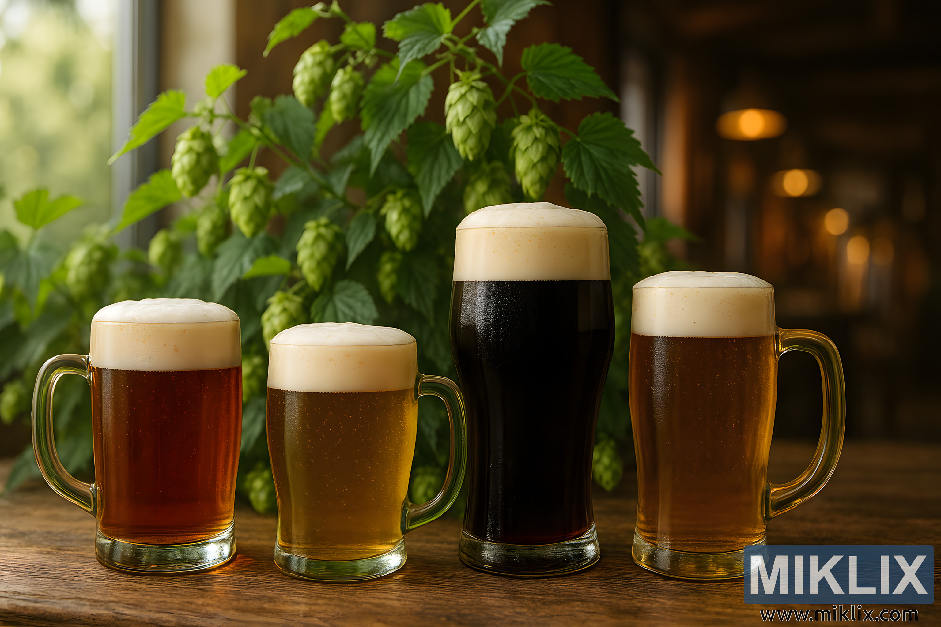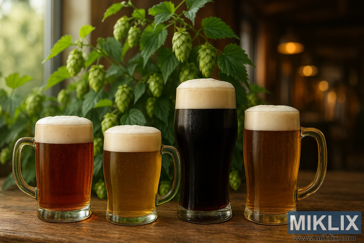 High-resolution landscape photo of four beers on a rustic wooden table, framed by lush hop plants and a warmly lit brewery interior. Amber, golden, dark, and pale beers with creamy foam heads are captured in natural window light, creating a cozy, elegant beer tasting atmosphere ideal for brewery, craft beer, or tasting room presentations.