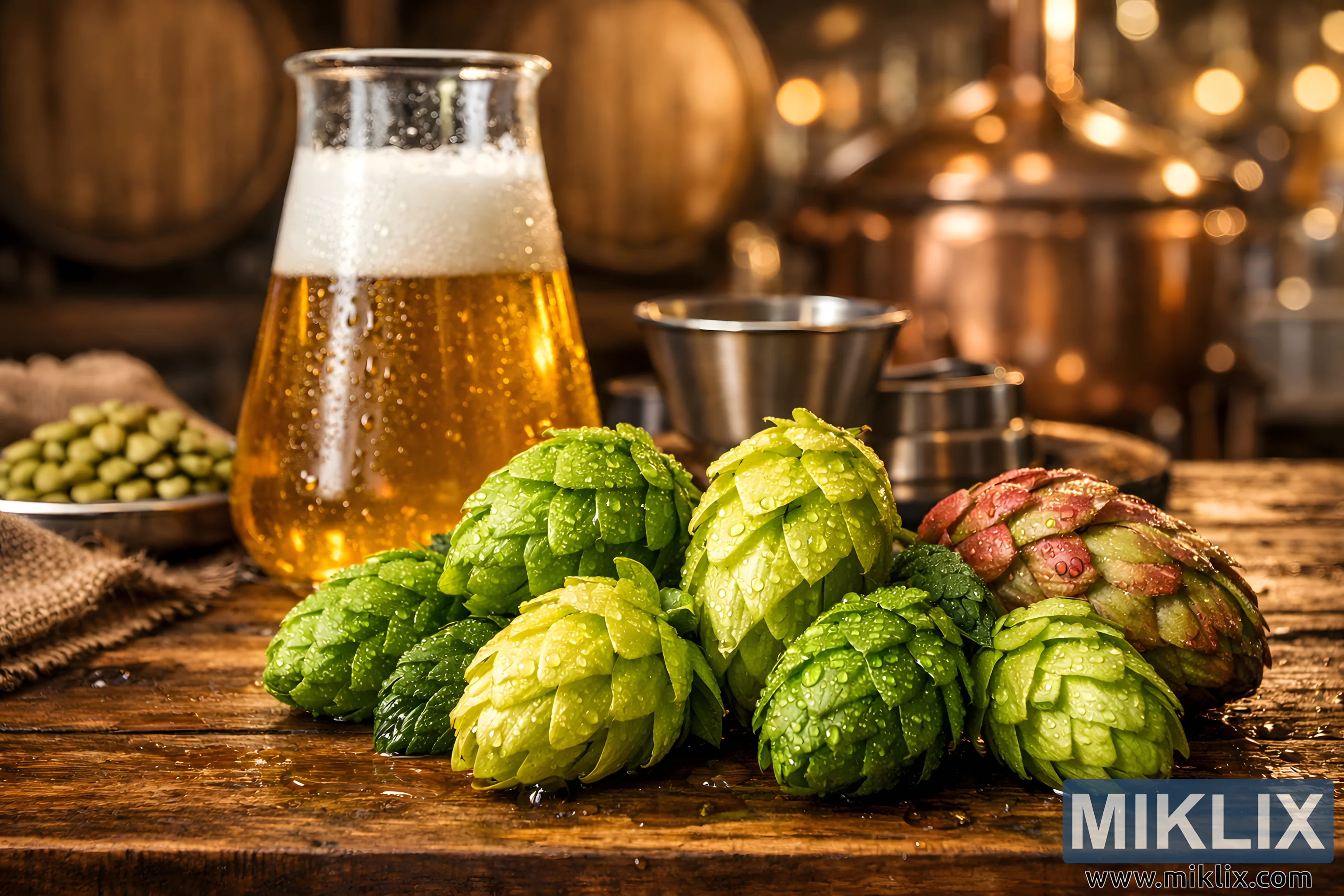 Detailed close-up image of aromatic hop substitutes on a wooden table with a glass of golden beer and brewing equipment, set against a warm, softly blurred brewery interior.