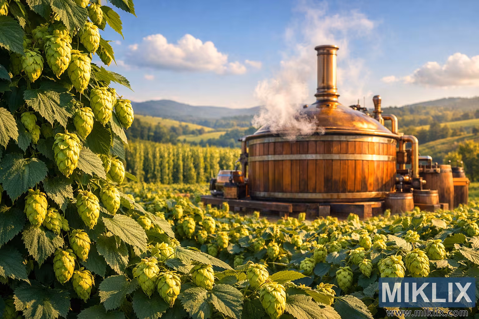 Wide-angle landscape image of a vibrant hop field at golden hour, featuring ripe hop cones and a steaming wooden brewing kettle against soft rolling hills and a clear blue sky.