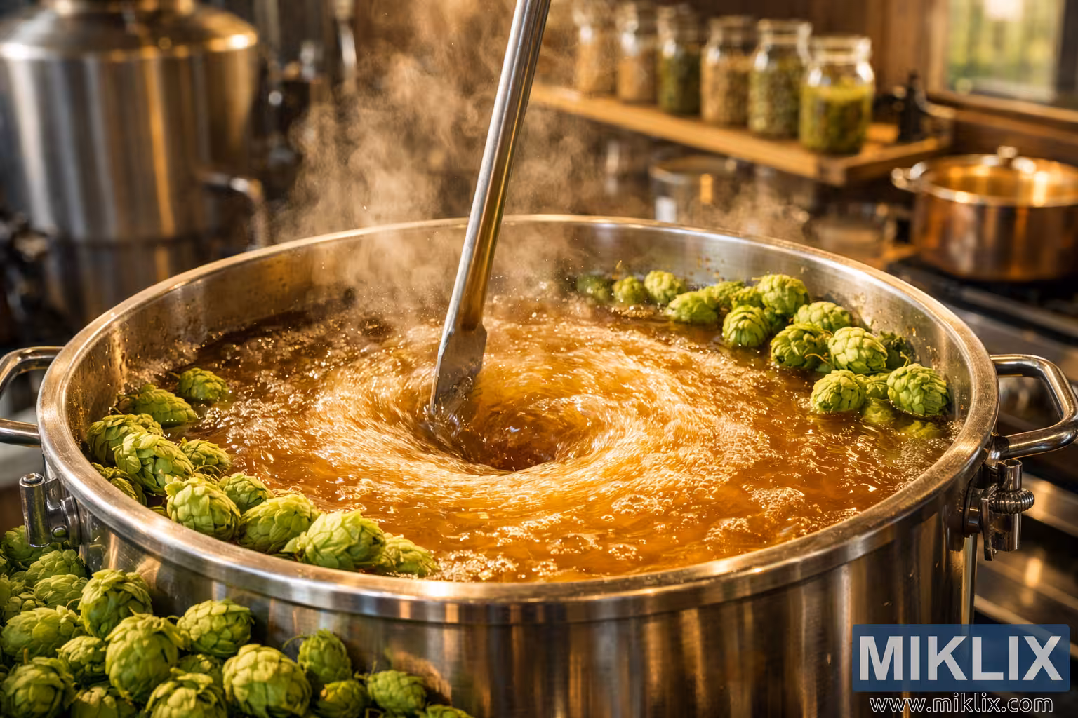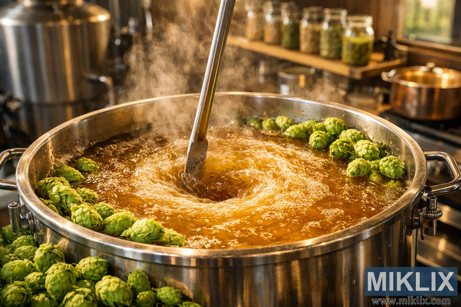 High-resolution landscape image of a craft brewing scene featuring a stainless steel kettle with swirling golden wort, fresh green hops, rising steam, and warm, diffused lighting in a professional brewery kitchen.