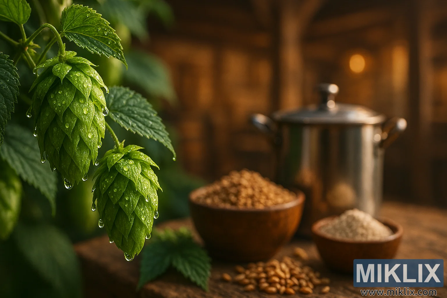 The lighting throughout the image is cinematic and natural, with high dynamic range capturing both shadow and highlight detail. The composition is balanced, with the hop cones occupying the left third of the frame and the brewing equipment and ingredients filling the middle and right. This visual arrangement guides the viewer’s eye from the freshness of the hops to the tools of transformation, encapsulating the passion and artistry of craft beer brewing.