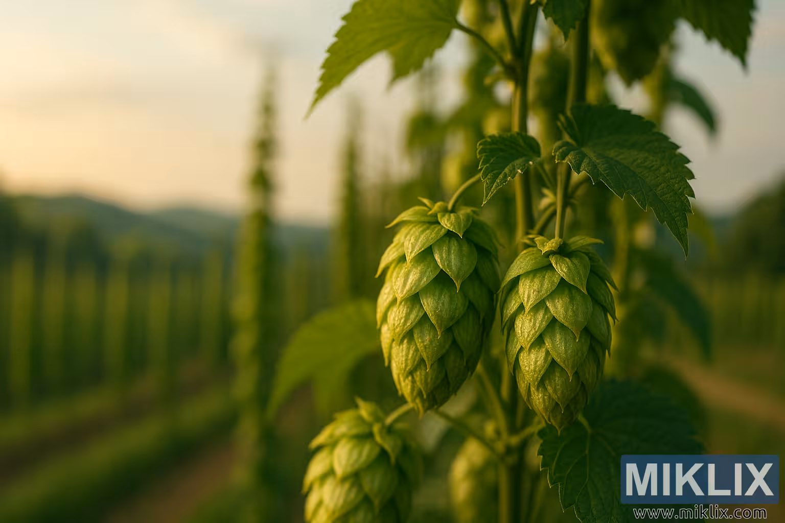 A richly detailed image of Strisselspalt hops at golden hour, featuring textured cones, climbing vines, and a softly blurred hop farm landscape.