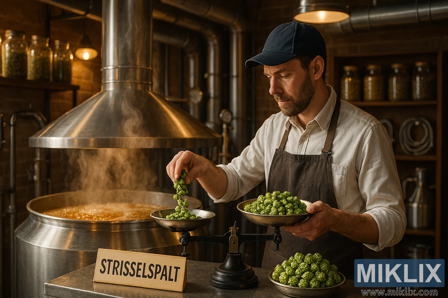 A skilled brewer measures aromatic Strisselspalt hops in a warm, modern brewery with gleaming equipment and bubbling wort.