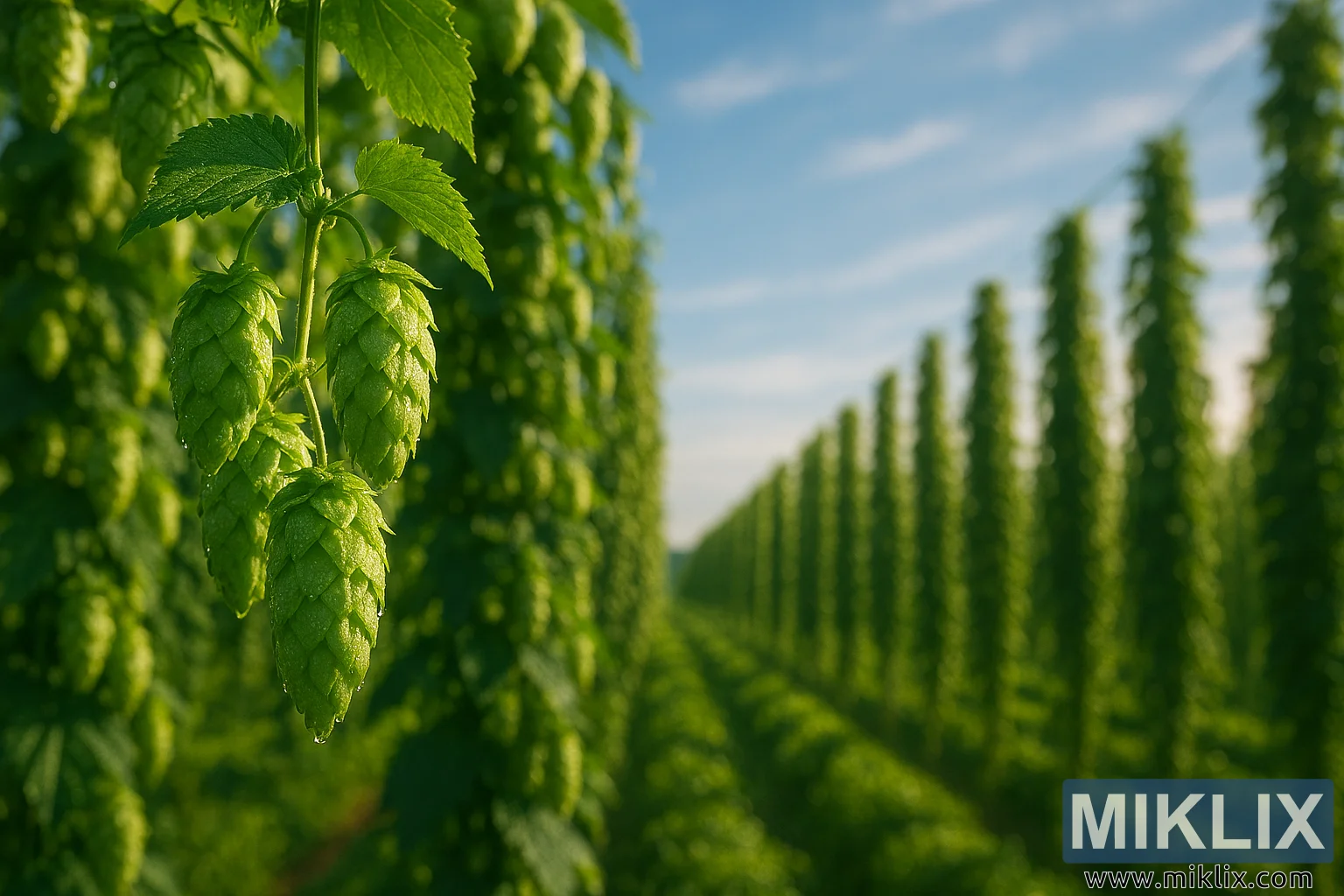 A vibrant landscape photo of Strisselspalt hop cones glistening with dew in a sun-drenched field, captured from a low angle with rows of vines and a clear blue sky.