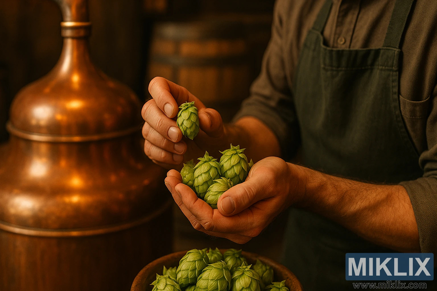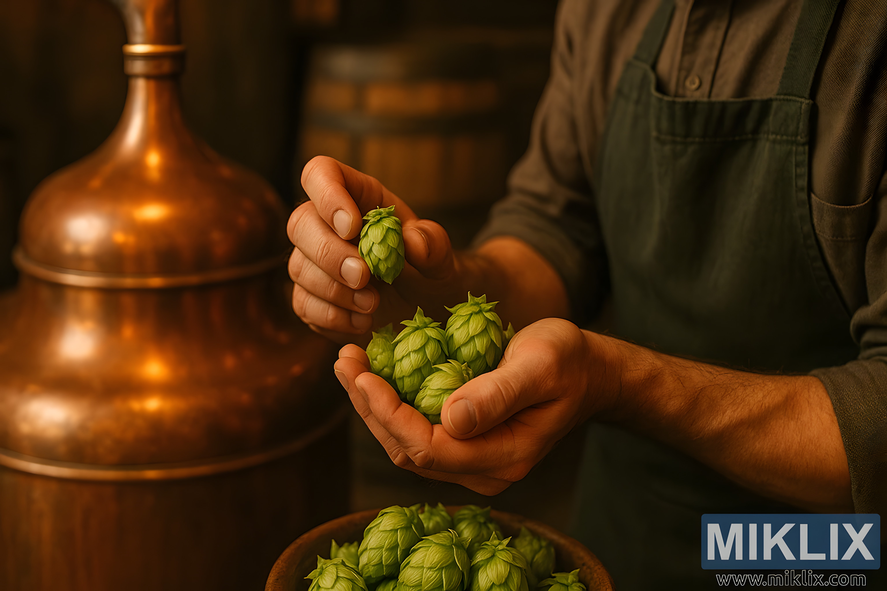 The lighting ties the entire composition together. Soft, golden, and warm, it flows across the scene with an almost reverential quality, casting gentle shadows that emphasize textures—the ridges of the hop cones, the smoothness of copper, the rough grain of oak. This play of light and shadow doesn’t merely illuminate; it sets a mood, one that feels contemplative and timeless. It conveys pride, patience, and dedication, values inseparable from brewing at its highest level. The brewer, though only partially visible, is rendered present through his hands, the tools of his trade, revealing a quiet moment of connection between grower, ingredient, and artisan.