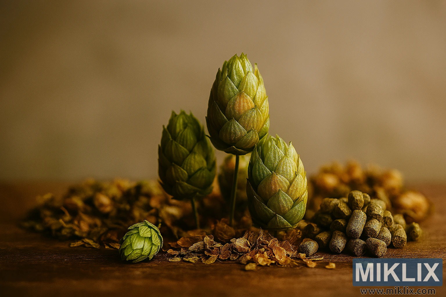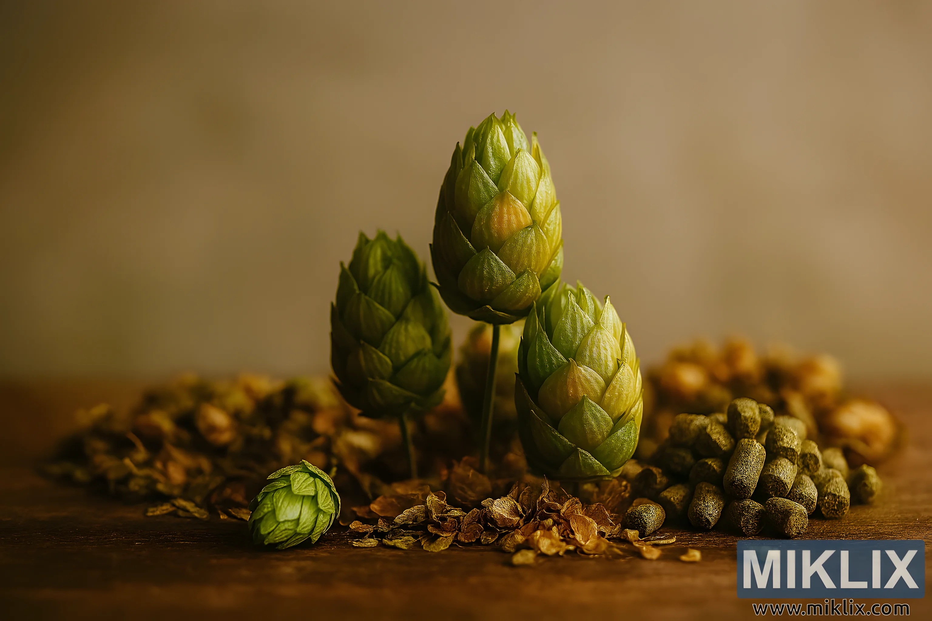 A richly detailed still life featuring fresh green hop cones, dried flowers, and hop pellets under warm lighting, showcasing the diversity of brewing ingredients.