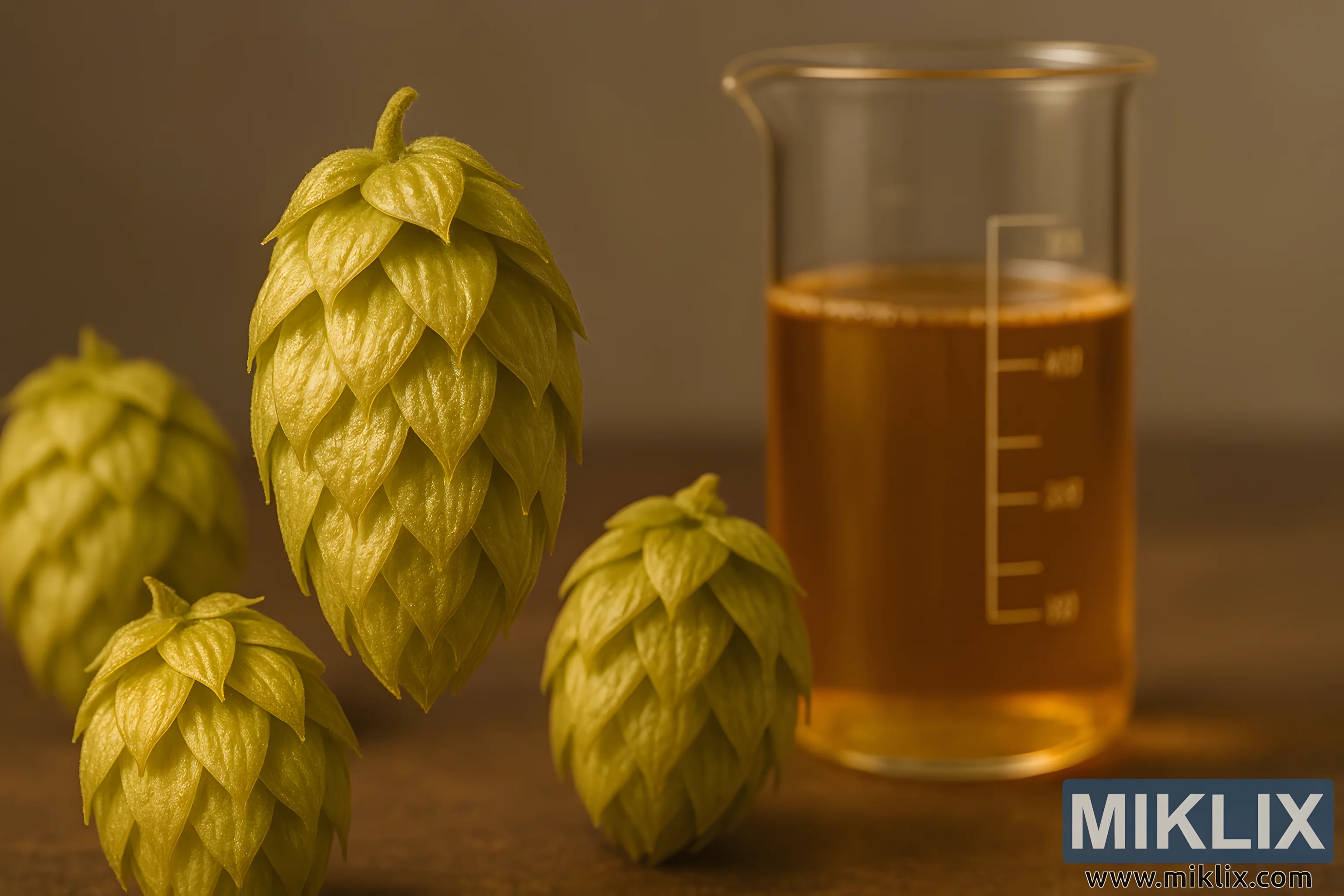 Close-up of Tettnanger hop cones with golden-green scales and a beaker of golden liquid, symbolizing their alpha acid content and role in brewing science.