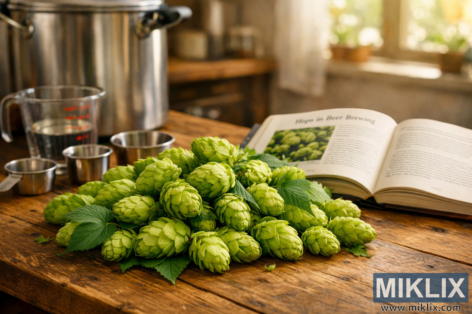 The hops rest casually yet intentionally on the warm-toned wooden surface, whose visible grain patterns and slight imperfections add authenticity and tactile richness to the composition. Surrounding the hops are classic homebrewing essentials that reinforce the craft-focused atmosphere. A polished stainless steel kettle stands slightly behind them, its reflective surface catching the ambient light and softly mirroring the surrounding environment. Nearby, a set of metal measuring cups and a transparent measuring jug are arranged neatly, suggesting preparation and precision. An open recipe book lies to one side, turned to a page discussing hops in beer brewing, visually connecting the raw ingredient to its transformation within the brewing process.
