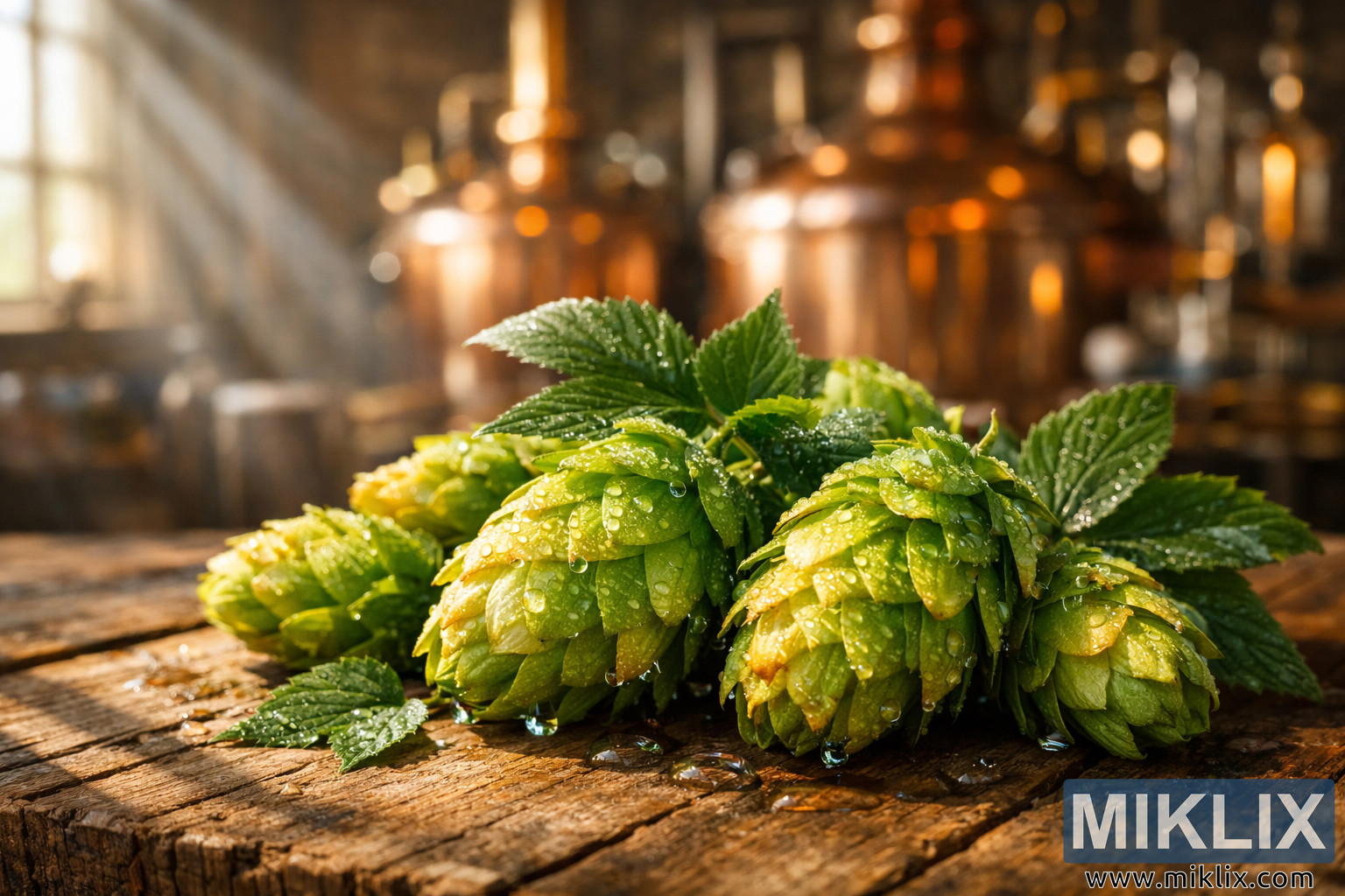 High-resolution landscape image of fresh Wai-iti hops with glistening water droplets on a rustic wooden table, set against a warmly lit, softly blurred copper brewery interior.
