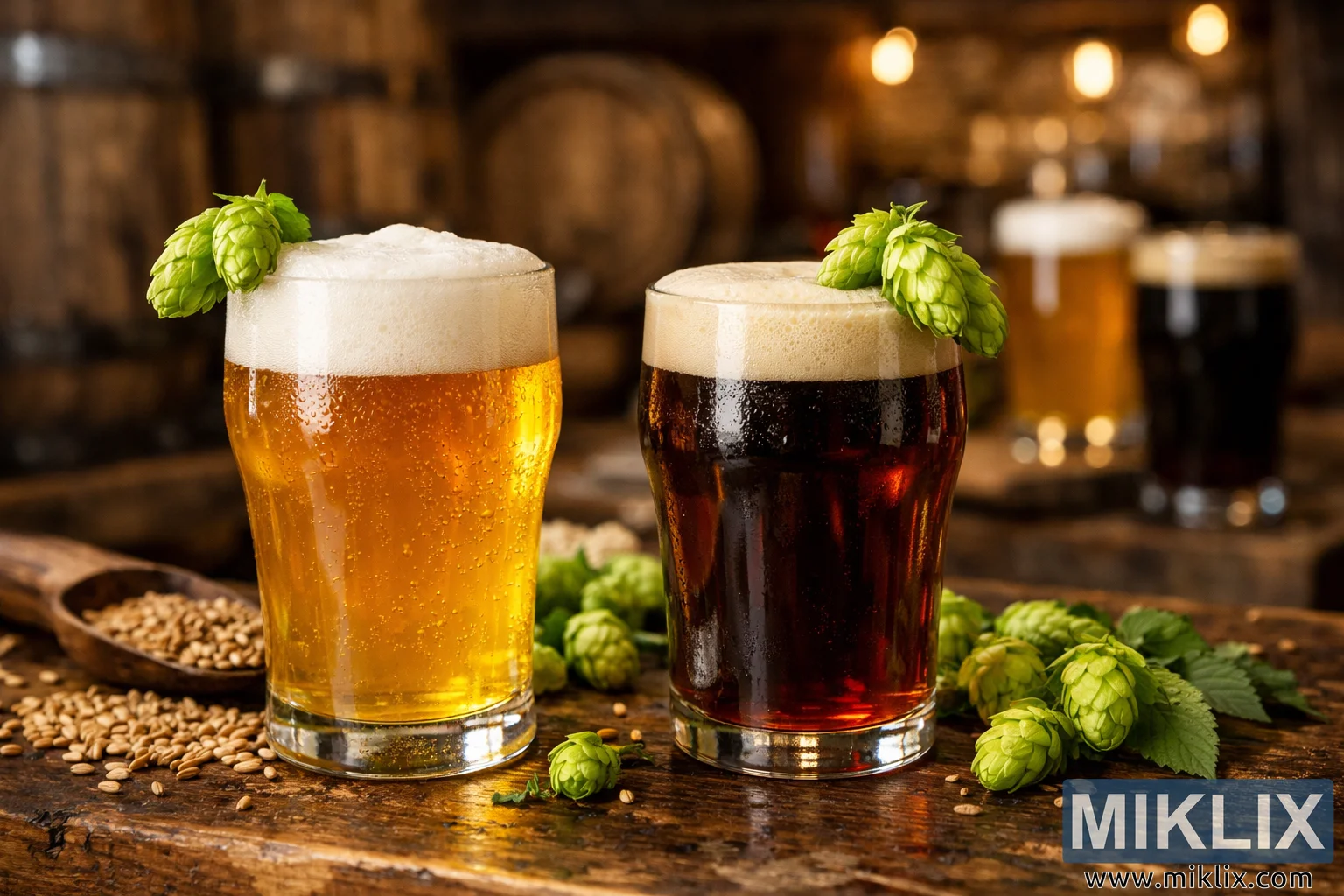 A high-resolution landscape image featuring a golden pale ale and a rich brown ale garnished with Wai-iti hop cones, surrounded by malt grains on a rustic wooden table in a warmly lit brewery.